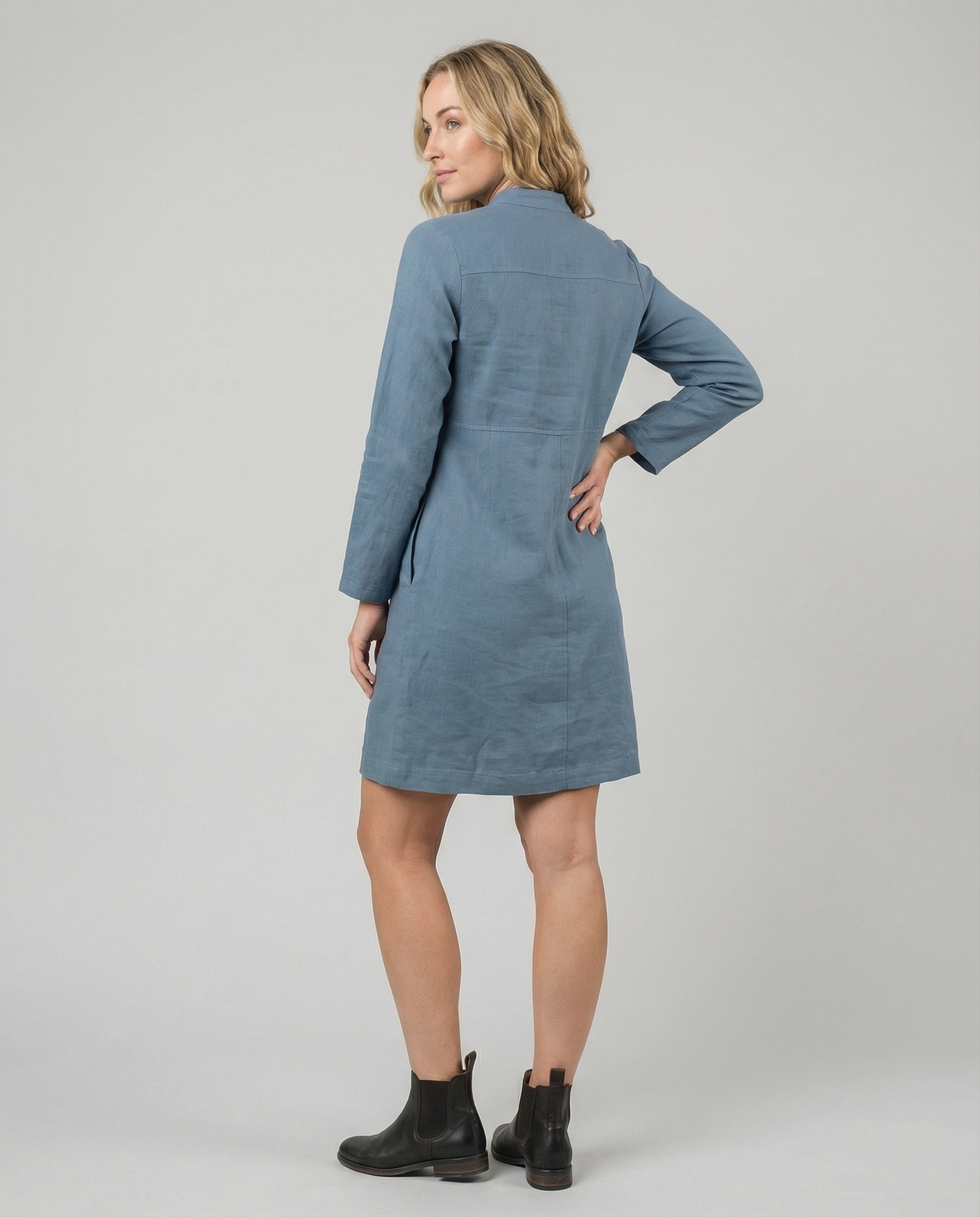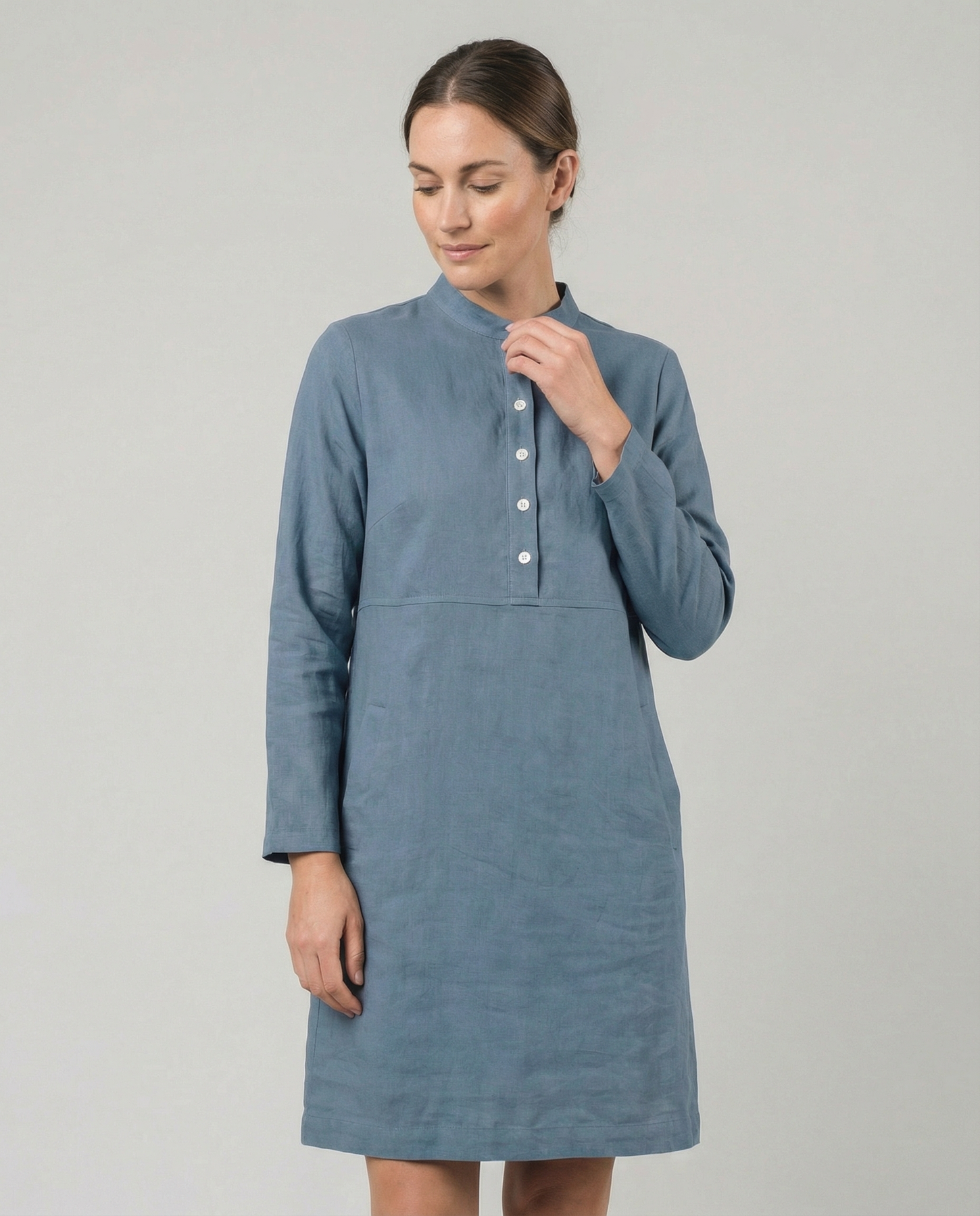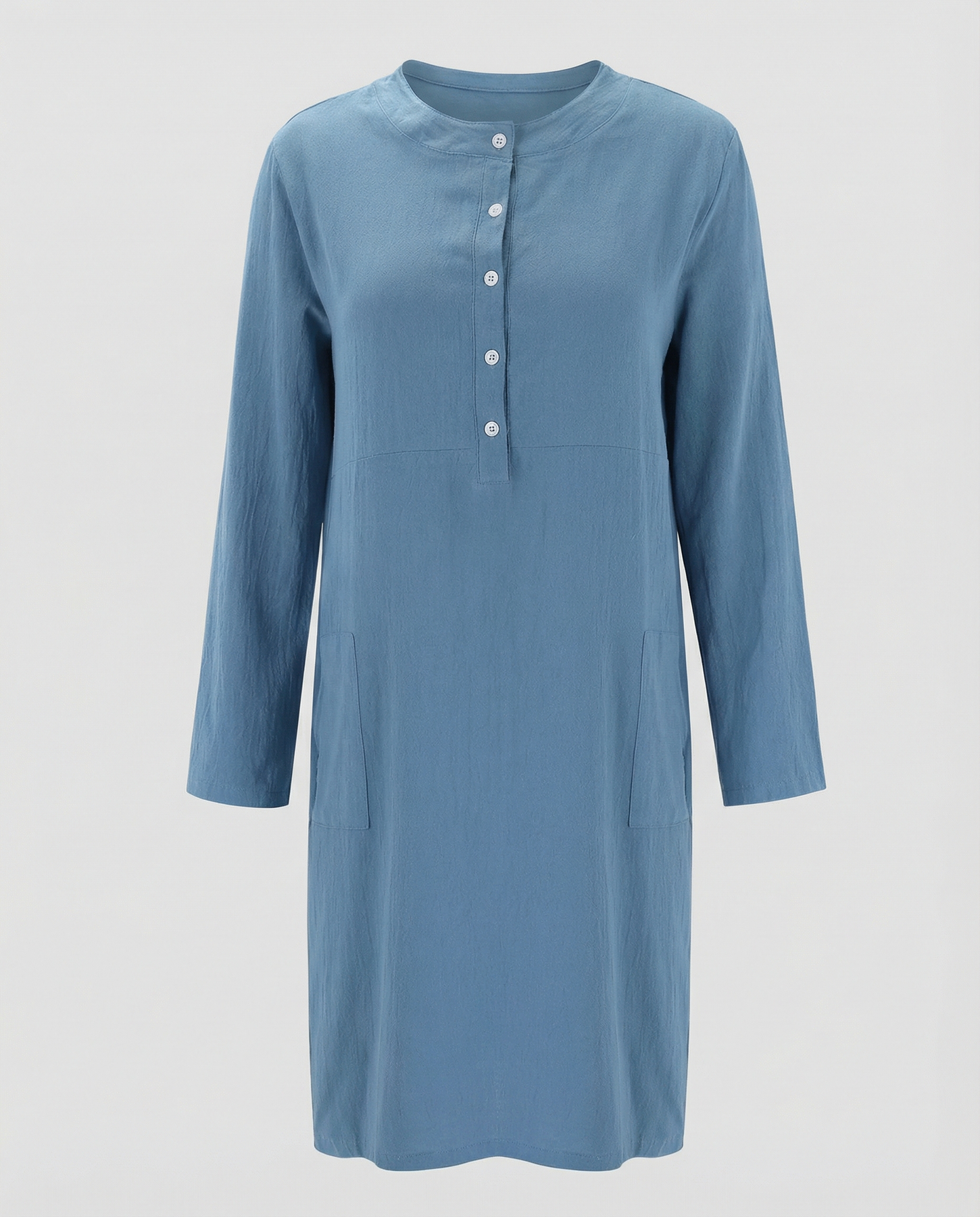 Denna långärmade klänning kombinerar bomullens mjukhet med linets eleganta struktur, vilket ger en lätt och bekväm outfit som samtidigt ser sofistikerad ut. Perfekt för dagar när du vill klä dig enkelt men ändå fashionabelt, med en design som låter dig röra dig fritt och känna dig bekväm hela dagen.