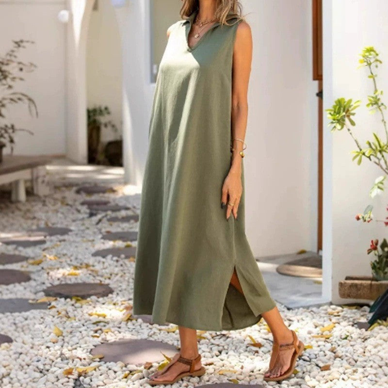 Upptäck den eleganta dammaxiklänningen med V-ringning och sidoflikar från Eva Jonsson, som är perfekt för varma dagar och speciella tillfällen. Denna klänning kombinerar stil och komfort och gör att du kan ha både en avslappnad och en elegant look.