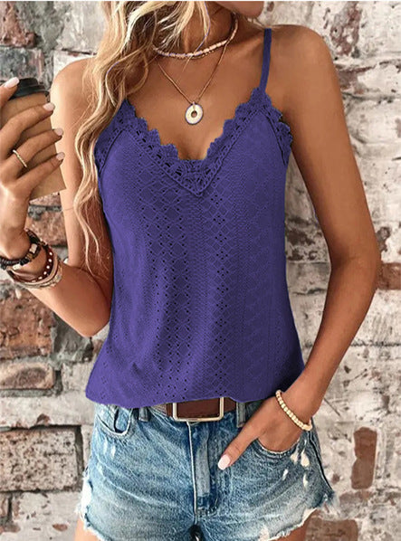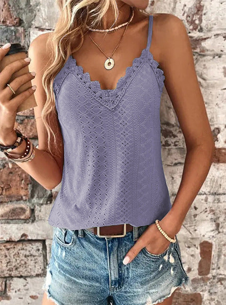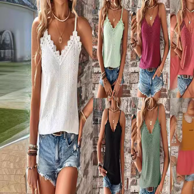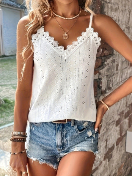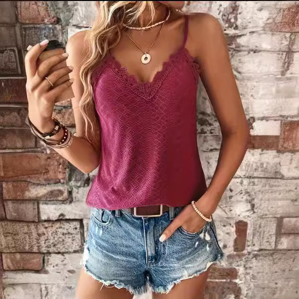 Elegant design: Med en V-ringning och fina spetsdetaljer på axelbanden, erbjuder denna topp en feminin touch.