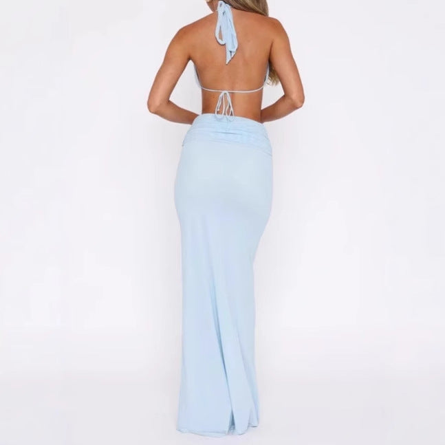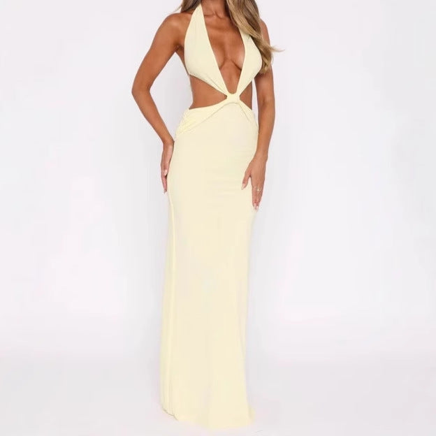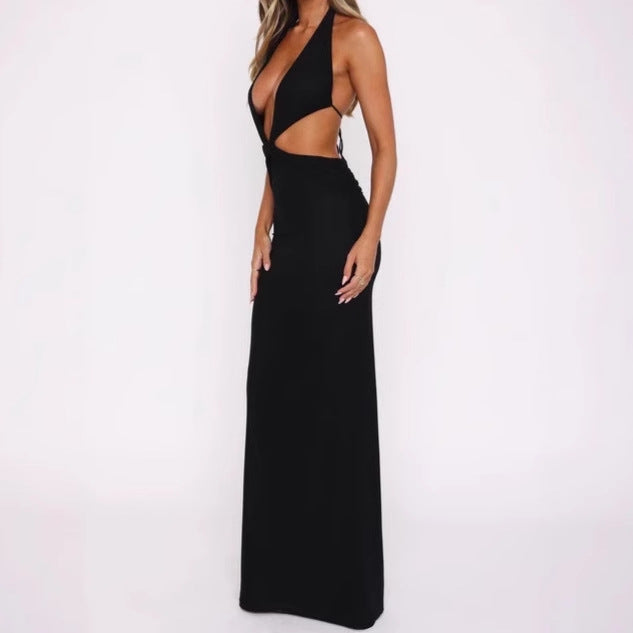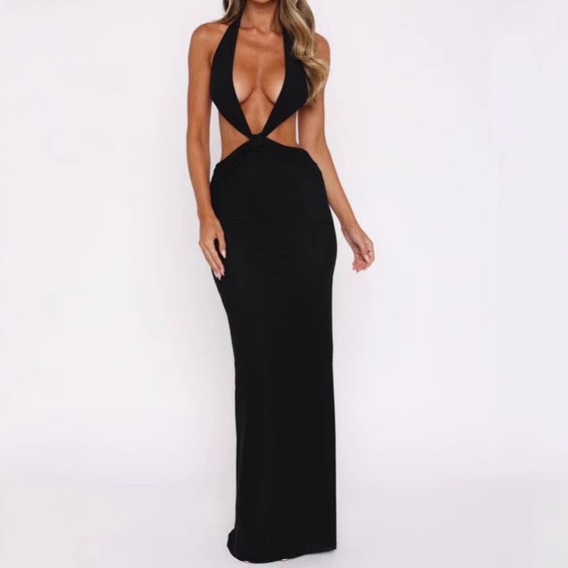 Stilren design: Maxiklänningen erbjuder en djup V-ringning och kreativa utskärningsdetaljer som sätter fokus på din silhuett.