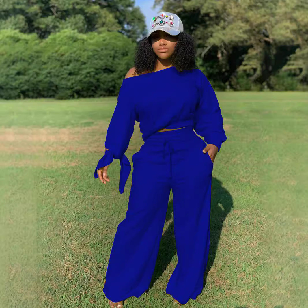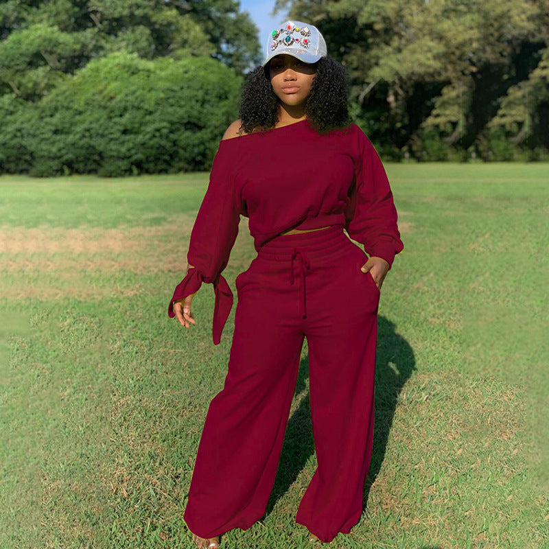 Design: Toppen har en trendig, off-shoulder design och avslappnade långa ärmar, medan byxorna har en elastisk midja för optimal passform.