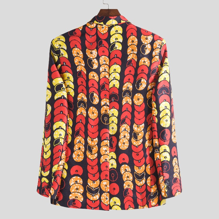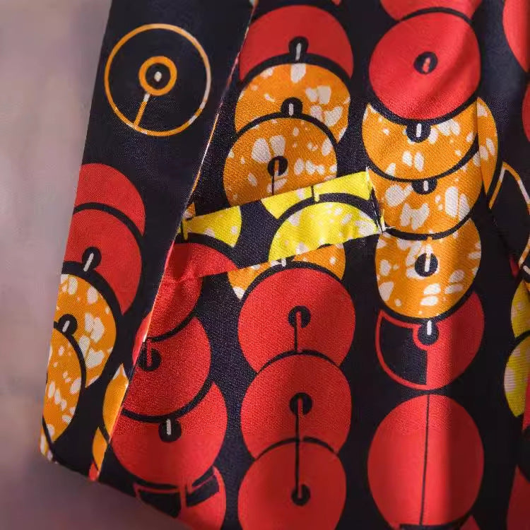 Vår damblazer förenar stiliga designer med utmärkt passform. Med ett livligt och kreativt mönster är denna blazer perfekt för speciella tillfällen eller avslappnade utflykter. Den höga kragen och de knäppta ärmarna ger den en elegant touch, medan det andningsbara tyget säkerställer hög komfort.