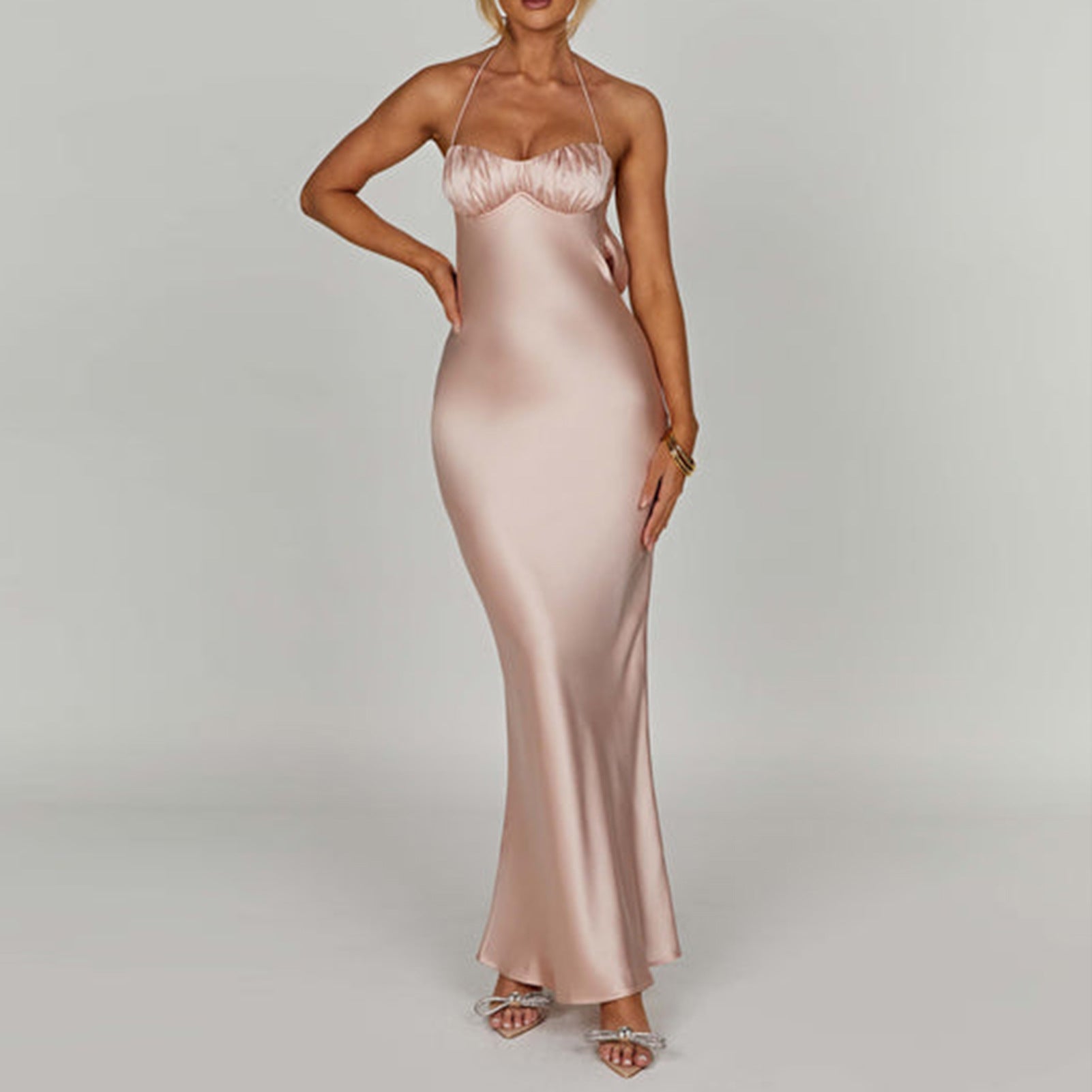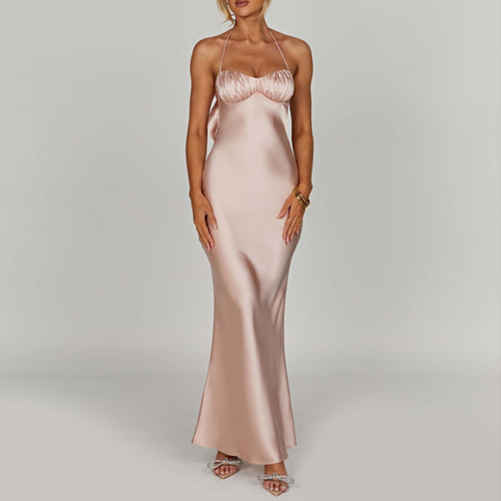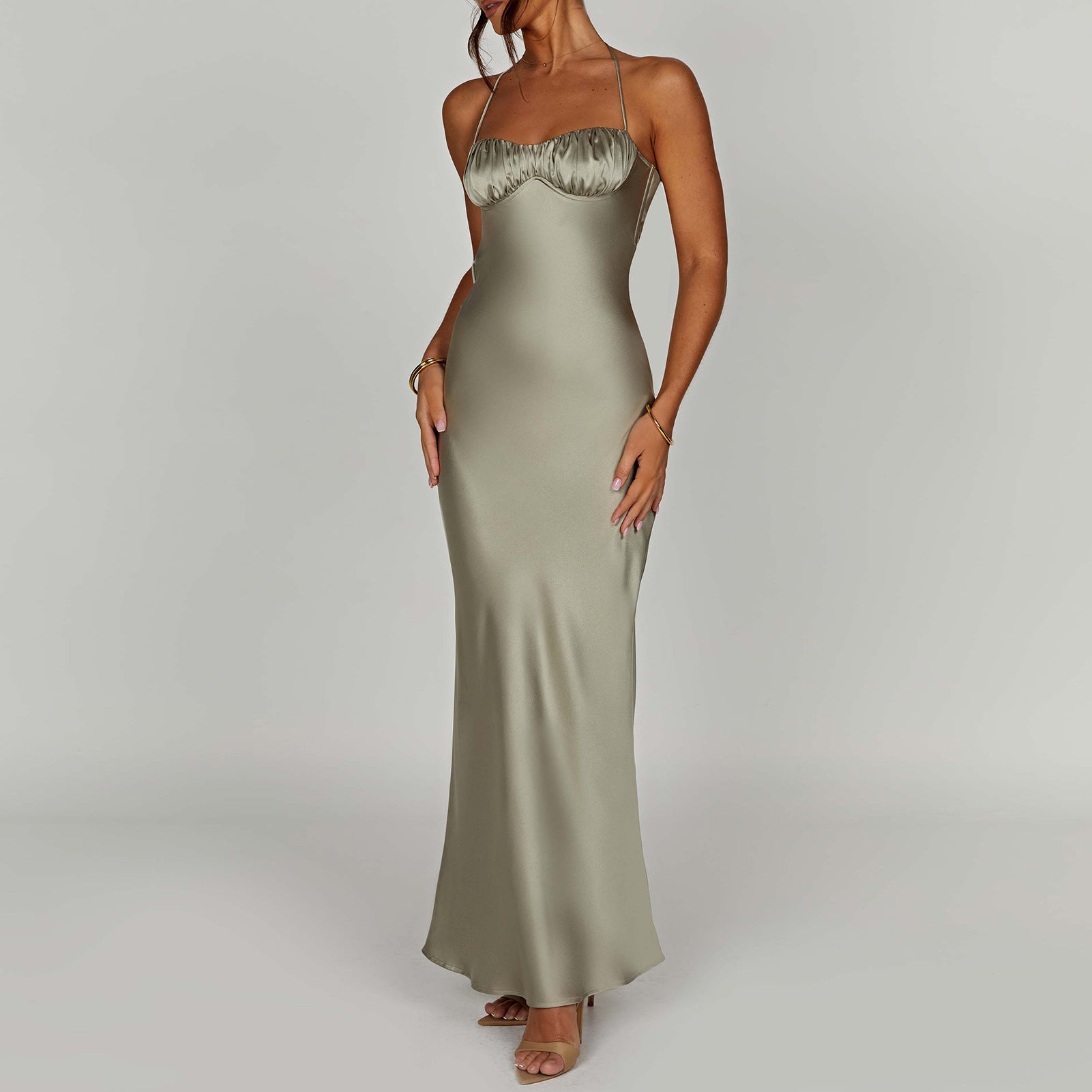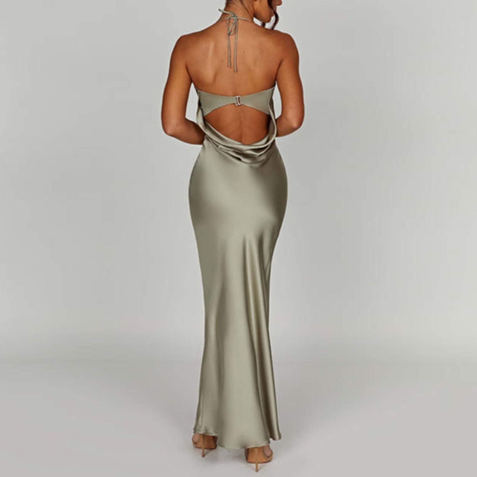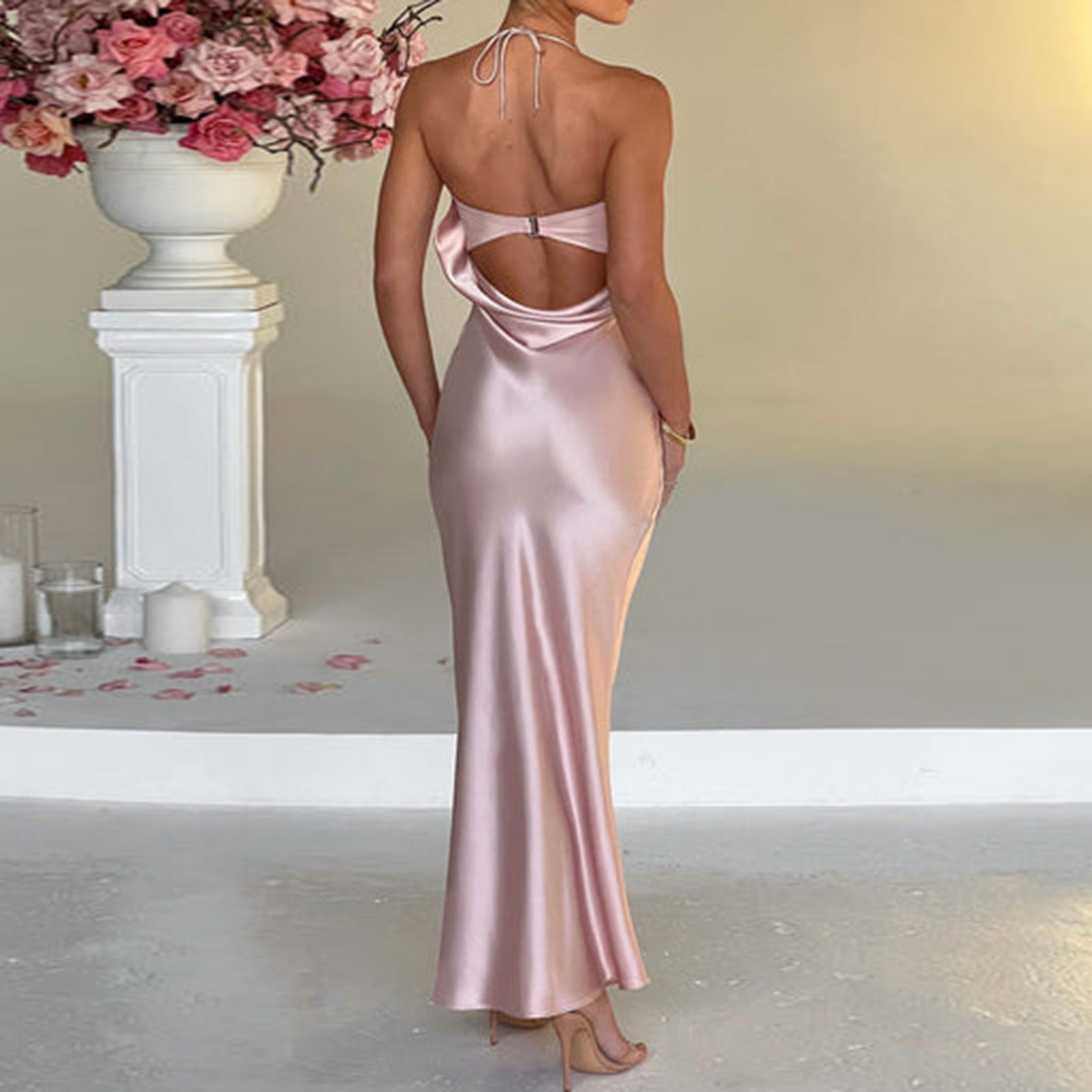 Denna klänning imponerar med sin flödande satintextur, som ger en lyxig look, medan de enkelt utseende axelbanden betonar den eleganta urringningen.