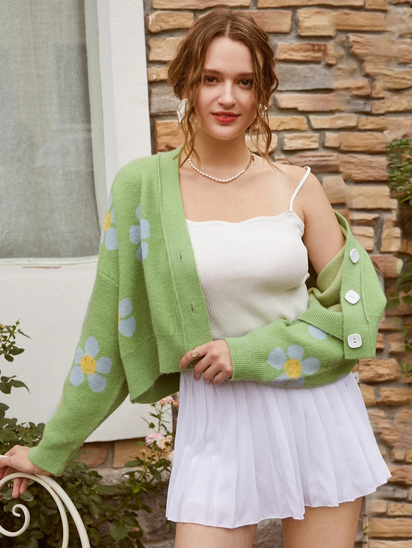 Upptäck vår stiliga korta stickade jacka för damer, som med sina blommiga mönster omedelbart fångar ögat. Denna jacka kombinerar komfort och modernt design, perfekt för alla tillfällen.