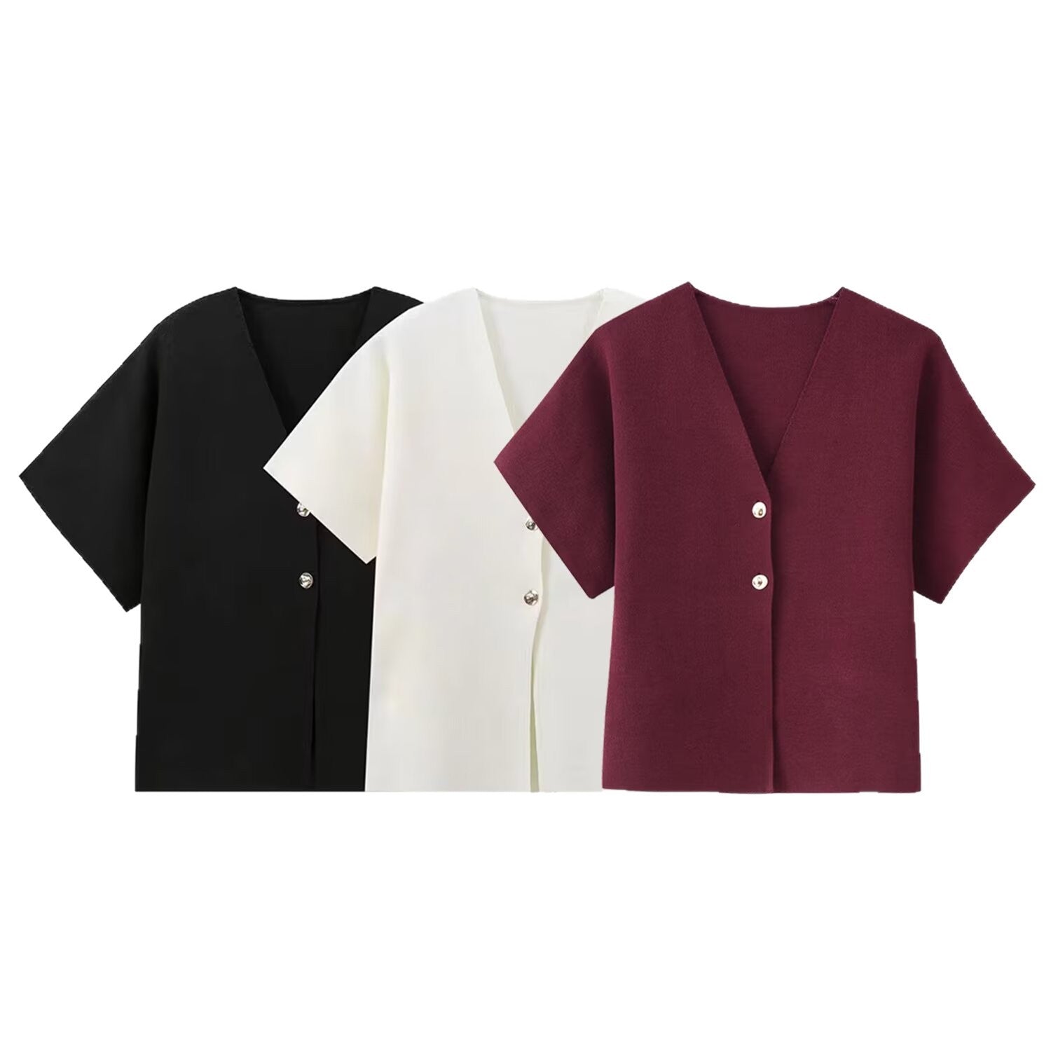 Upptäck vår stiliga kortärmade damjacka, som är perfekt för alla tillfällen. Denna jacka utmärker sig med sin eleganta V-hals och de dekorativa knapparna som ger varje outfit en raffinerad touch.