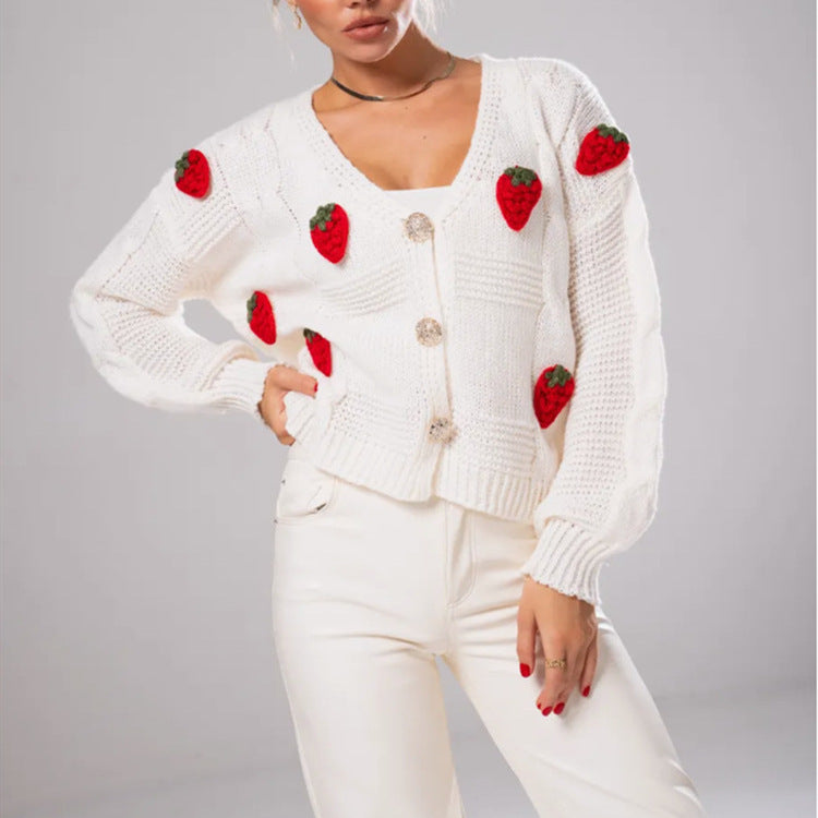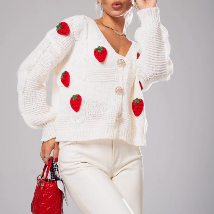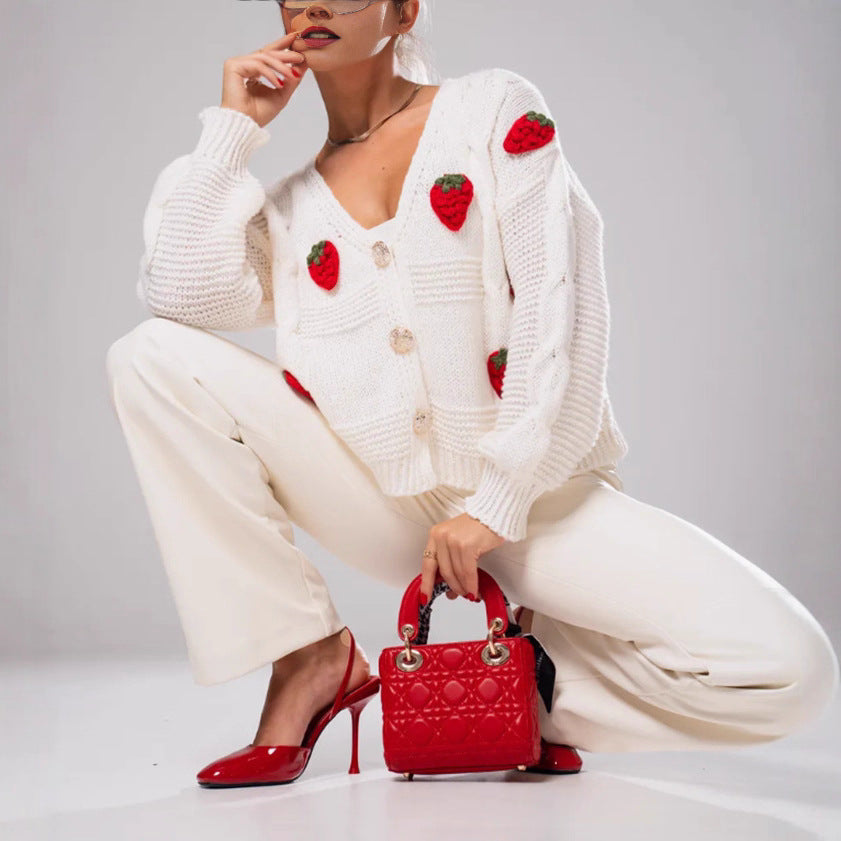 Lekfull design: Körsbärs-applikationerna ger cardignen en glad ton och gör den till den perfekta följeslagaren för avslappnade outfits.