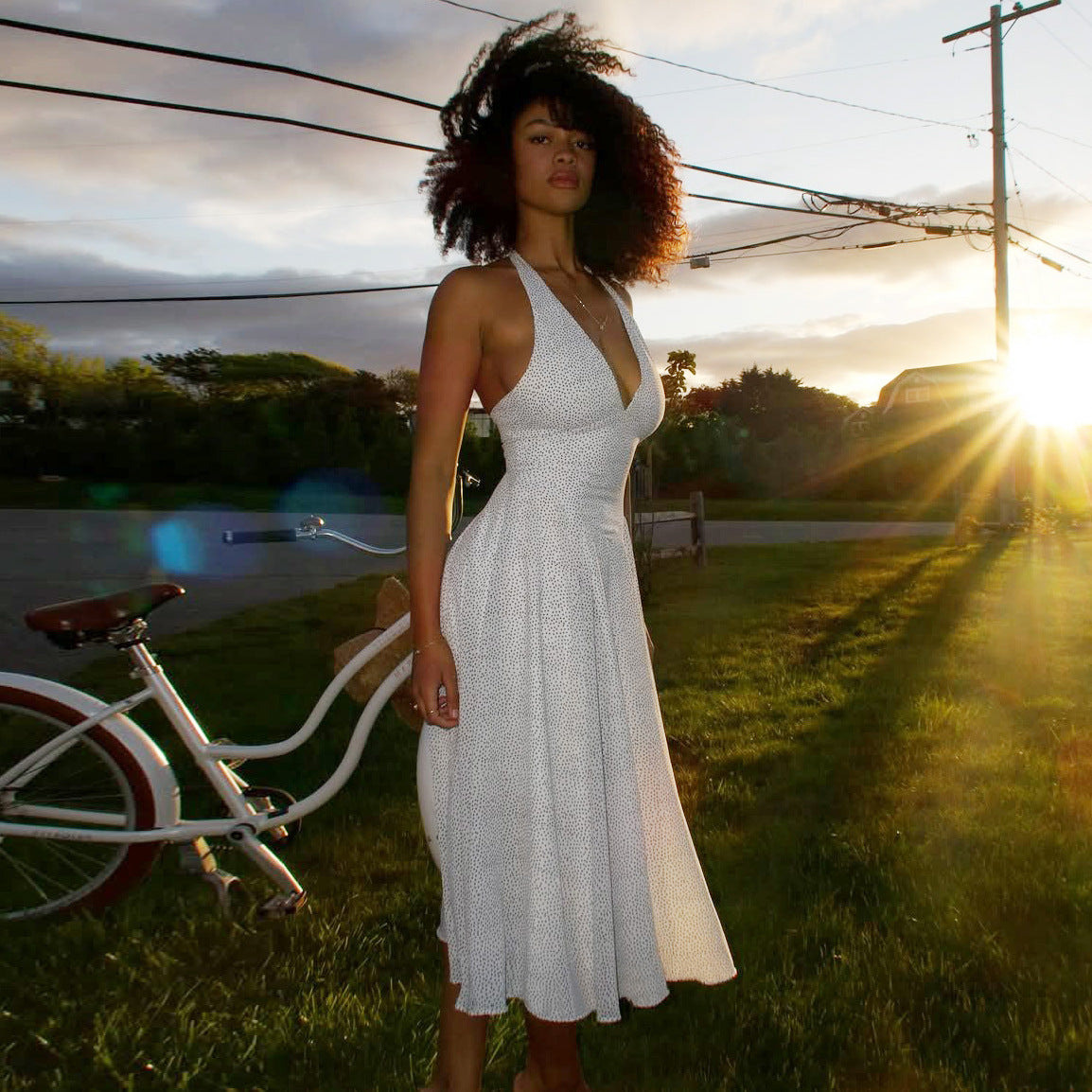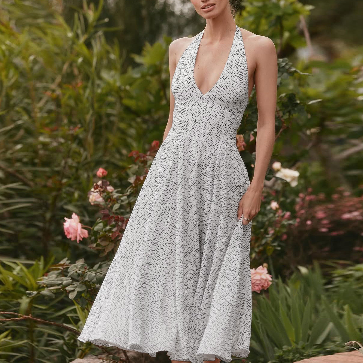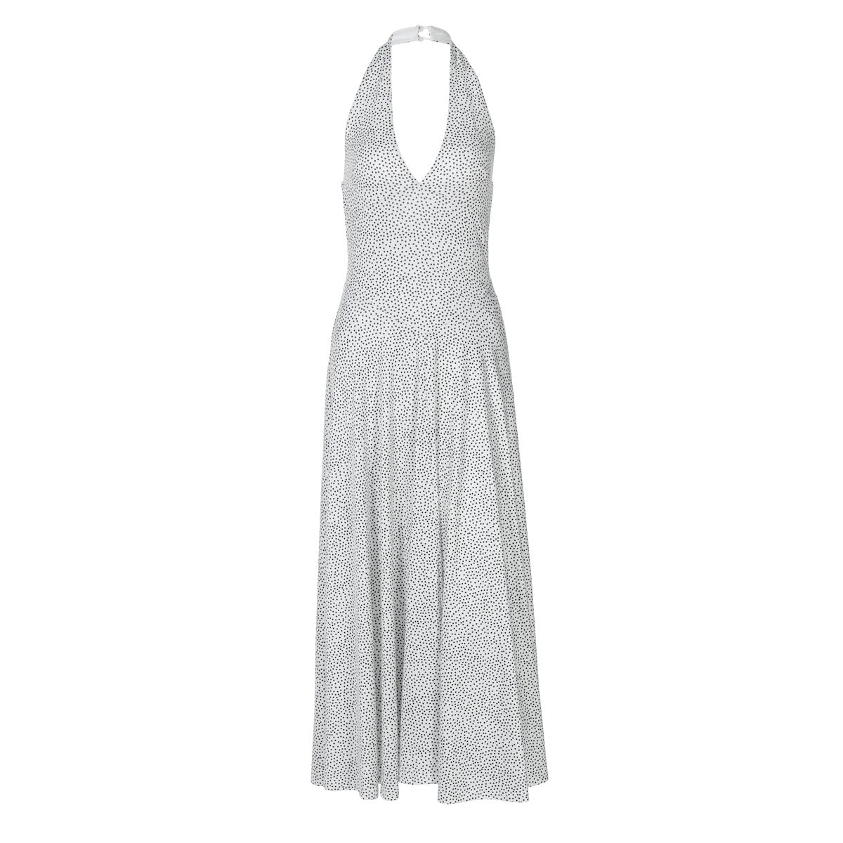 Upptäck den eleganta dam långärmad maxiklänning med djup V-urringning och sportig halterneck från Eva Jonsson. Denna högkvalitativa klänning är perfekt för olika tillfällen, från avslappnade träffar till eleganta kvällar.