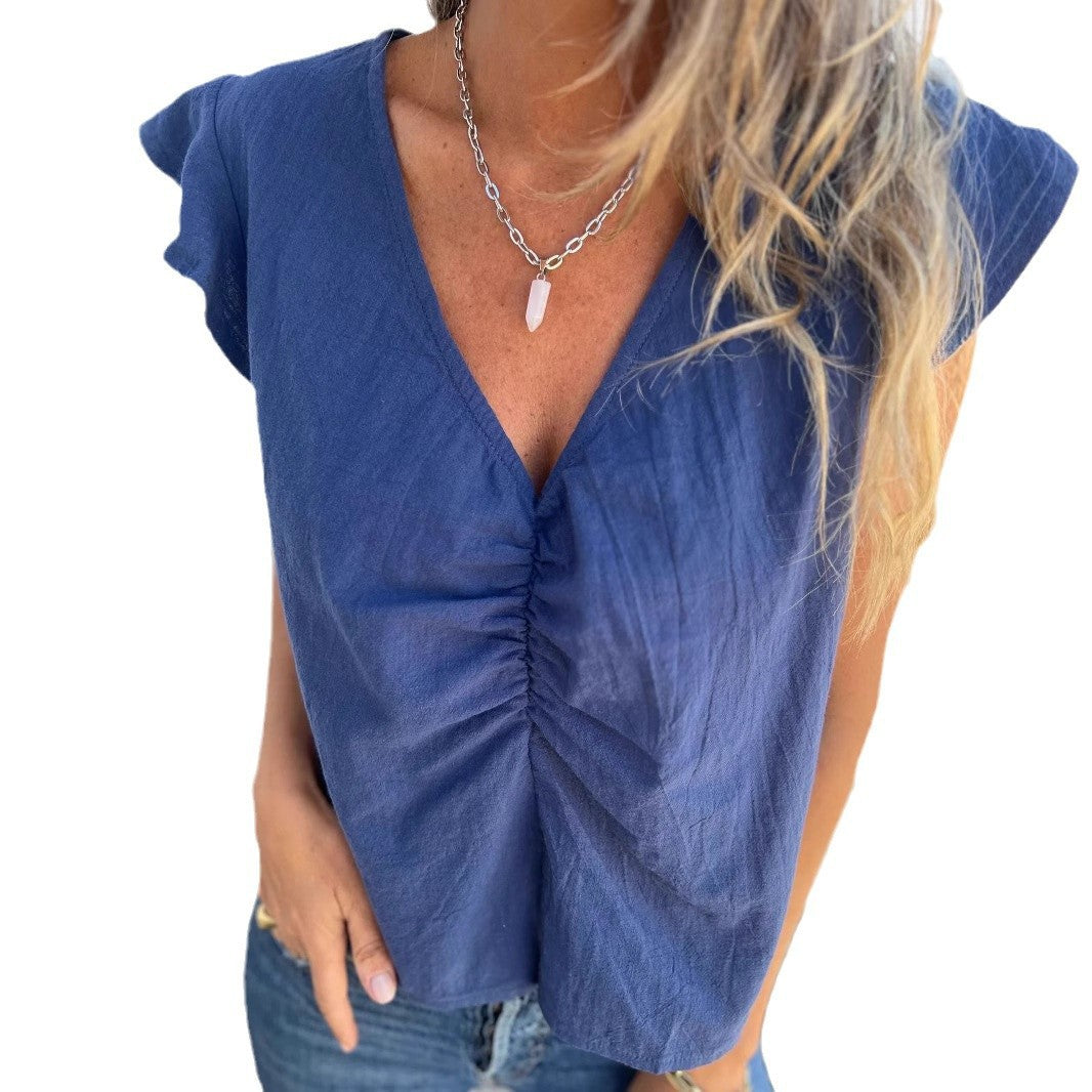 Upptäck den stiliga och luftiga blusen från Eva Jonsson, som är perfekt för varma sommar dagar. Denna blus utmärker sig med sin eleganta design och avslappnade snitt. Den har ömtåliga rynkelement fram som sätter en feminin accent. Volangärmarna ger en moderiktig känsla och erbjuder samtidigt bekväm rörelsefrihet.