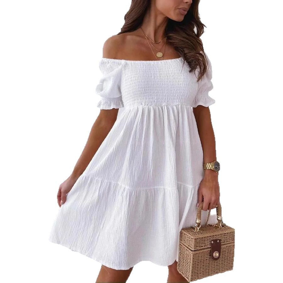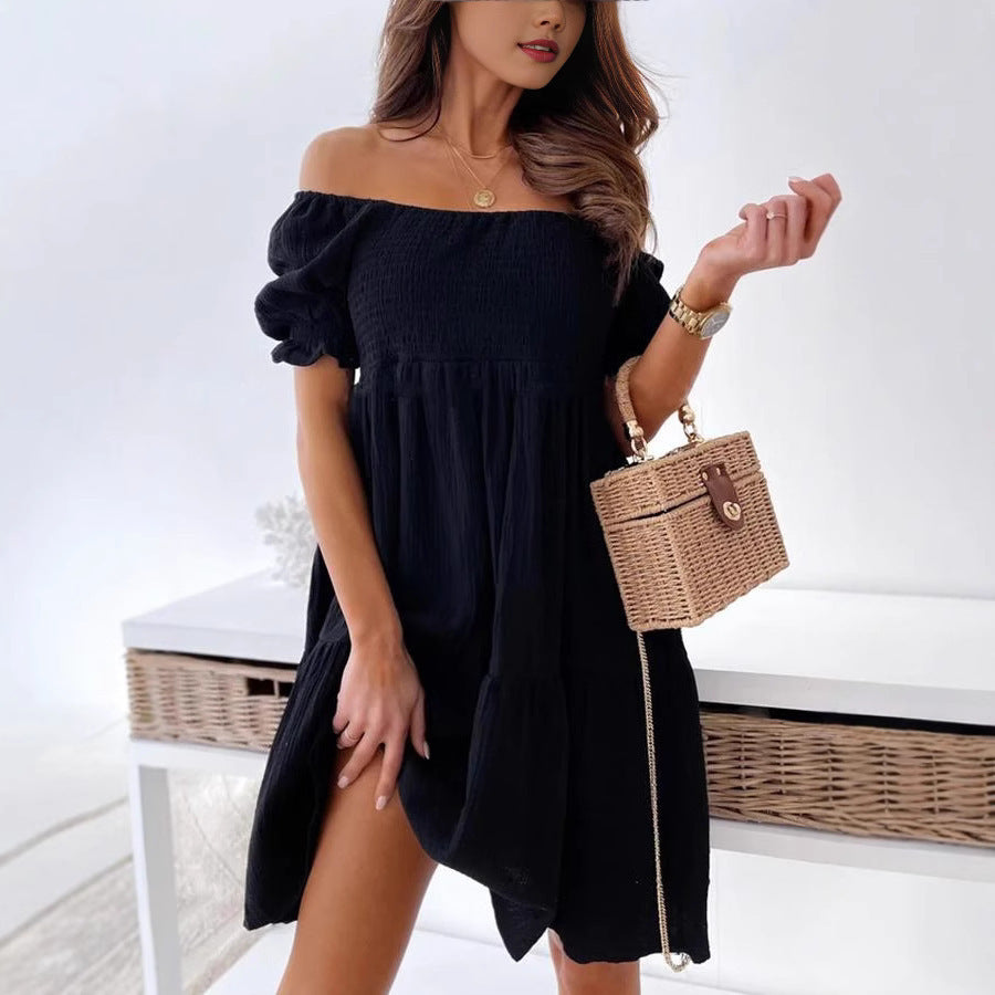 Upptäck den perfekta sommarklänningen för alla tillfällen med vår luftiga miniklänning. Denna eleganta klänning kännetecknas av en off-shoulder design och fina volanger som ger dig en feminin look.