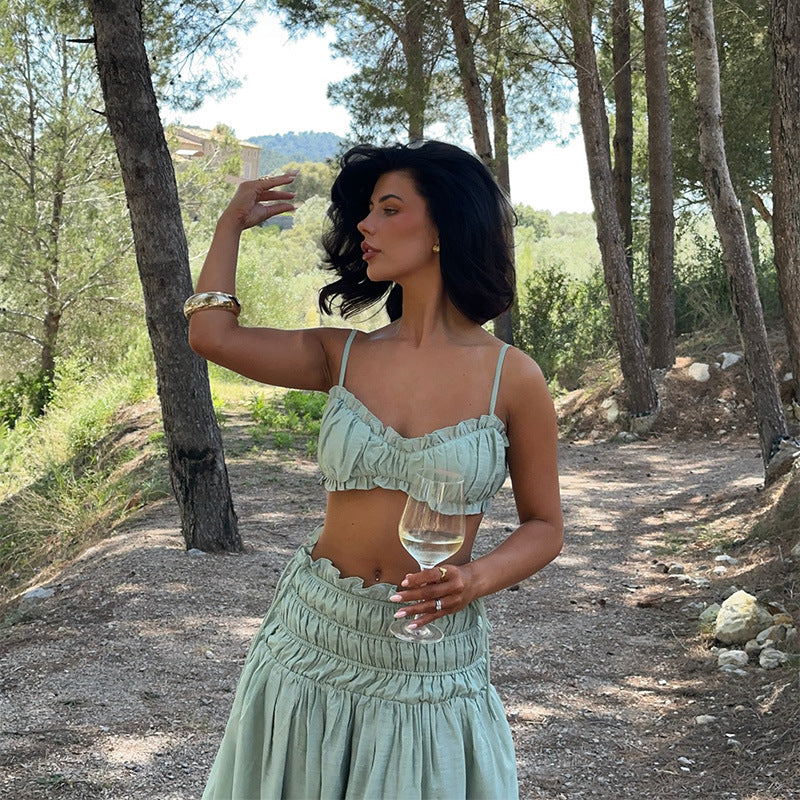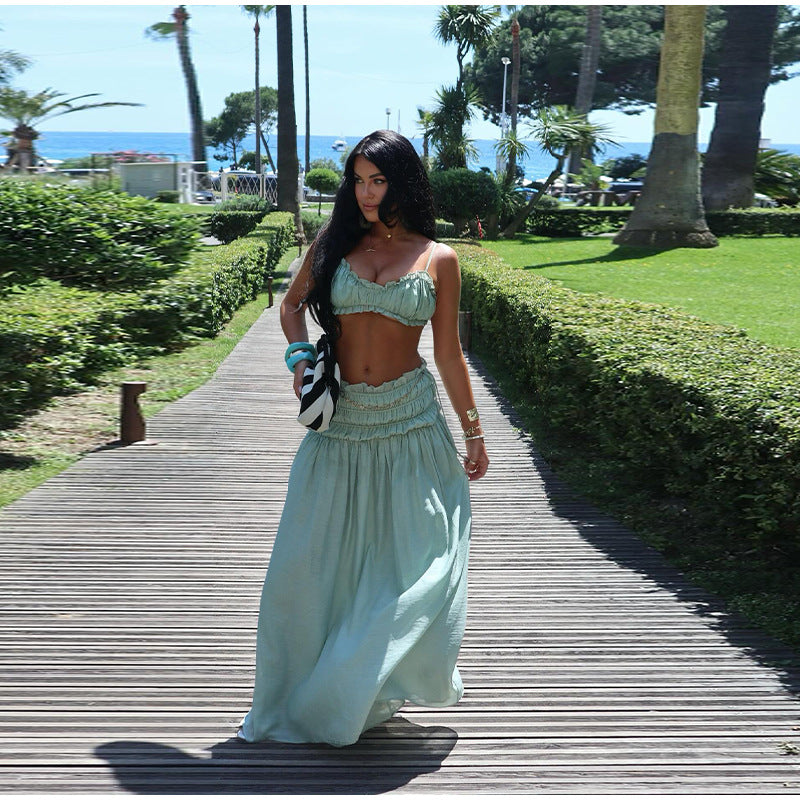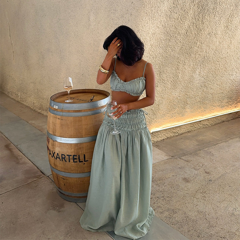 Denna fantastiska set består av en luftig omslagsblus och en elegant maxikjol, idealisk för varma dagar och festliga tillfällen.