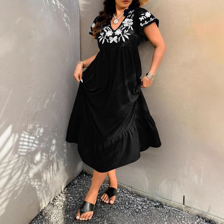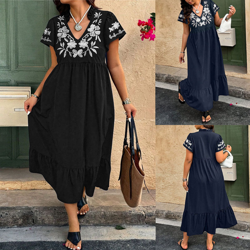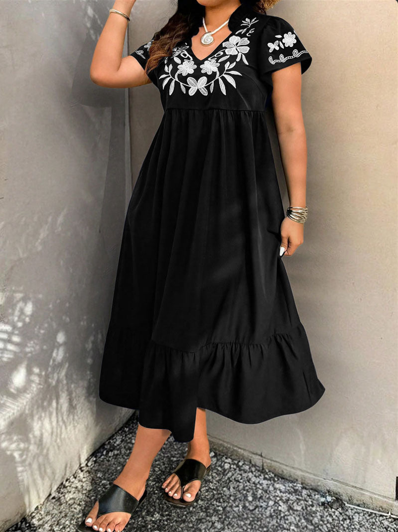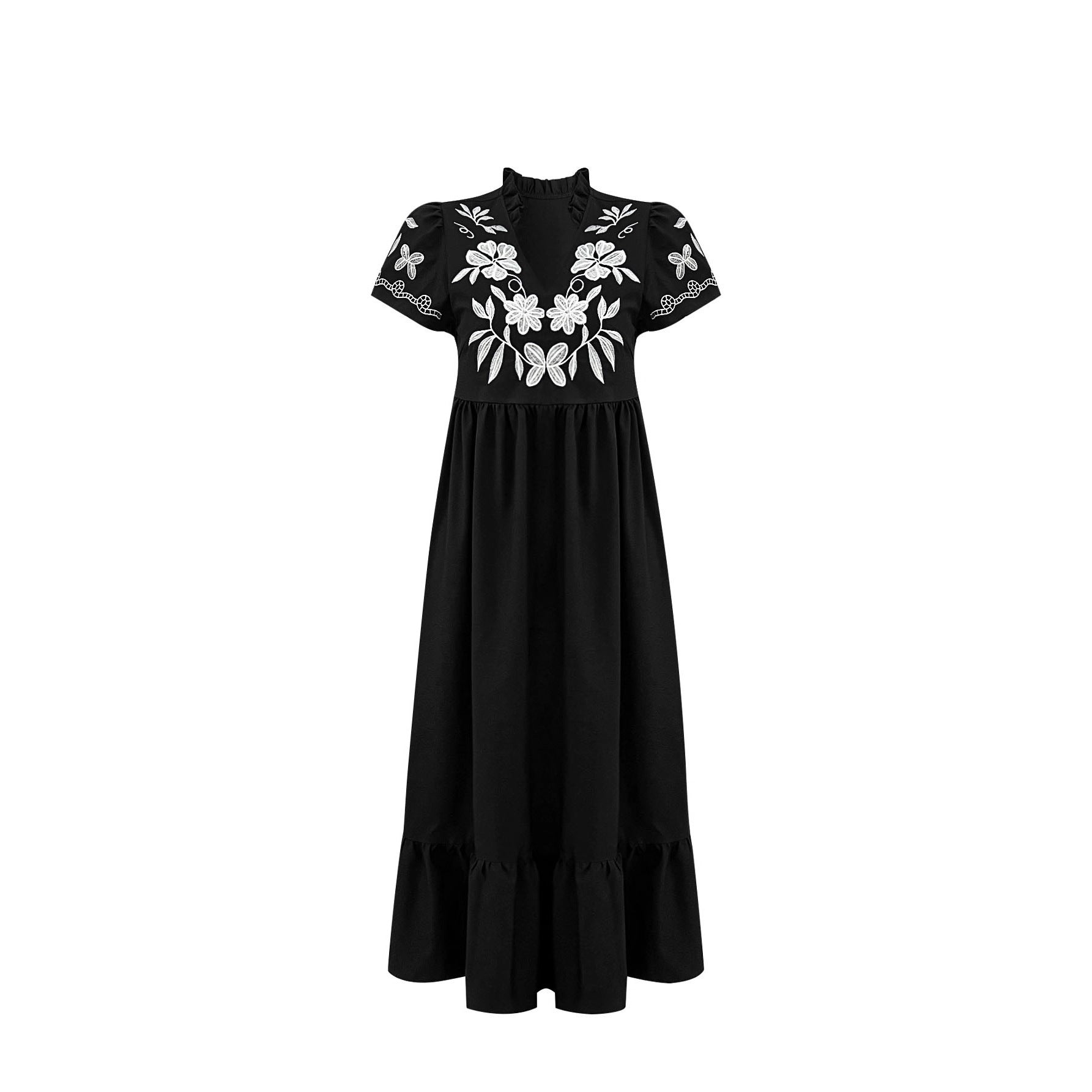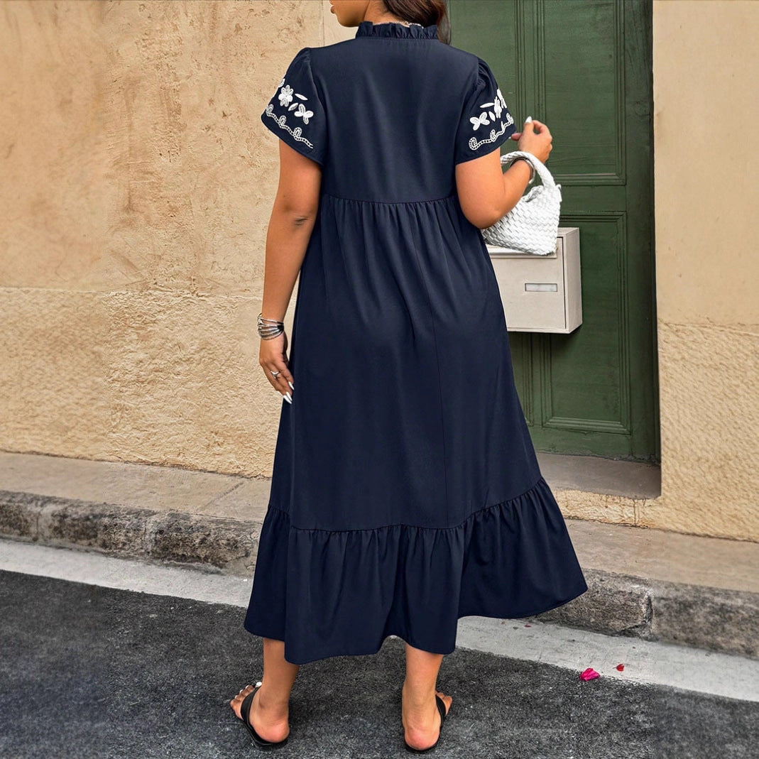 Eleganta detaljer: Den blommiga broderidesignen och volangerna vid fållen och ärmarna ger klänningen en romantisk charm.