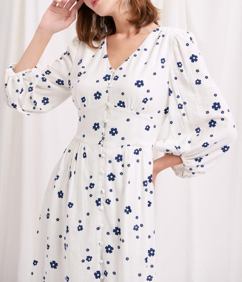 Upptäck vår vackra dammaxiklänning med blommönster och eleganta puffärmar från Eva Jonsson, som förenar perfekt stil och komfort. Denna klänning är idealisk för den varma årstiden och ger en fräsch, blommig look.