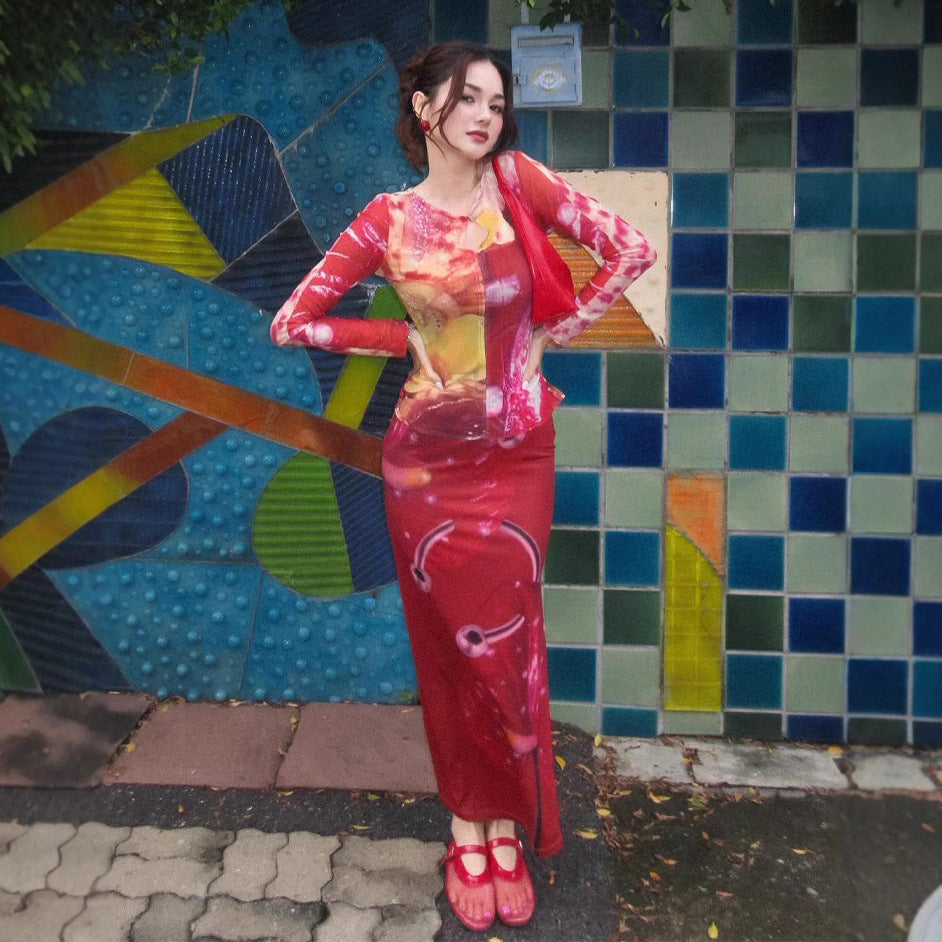 Damernas maxikjol med kreativ grafisk tryck och långa ärmar Eva Jonsson