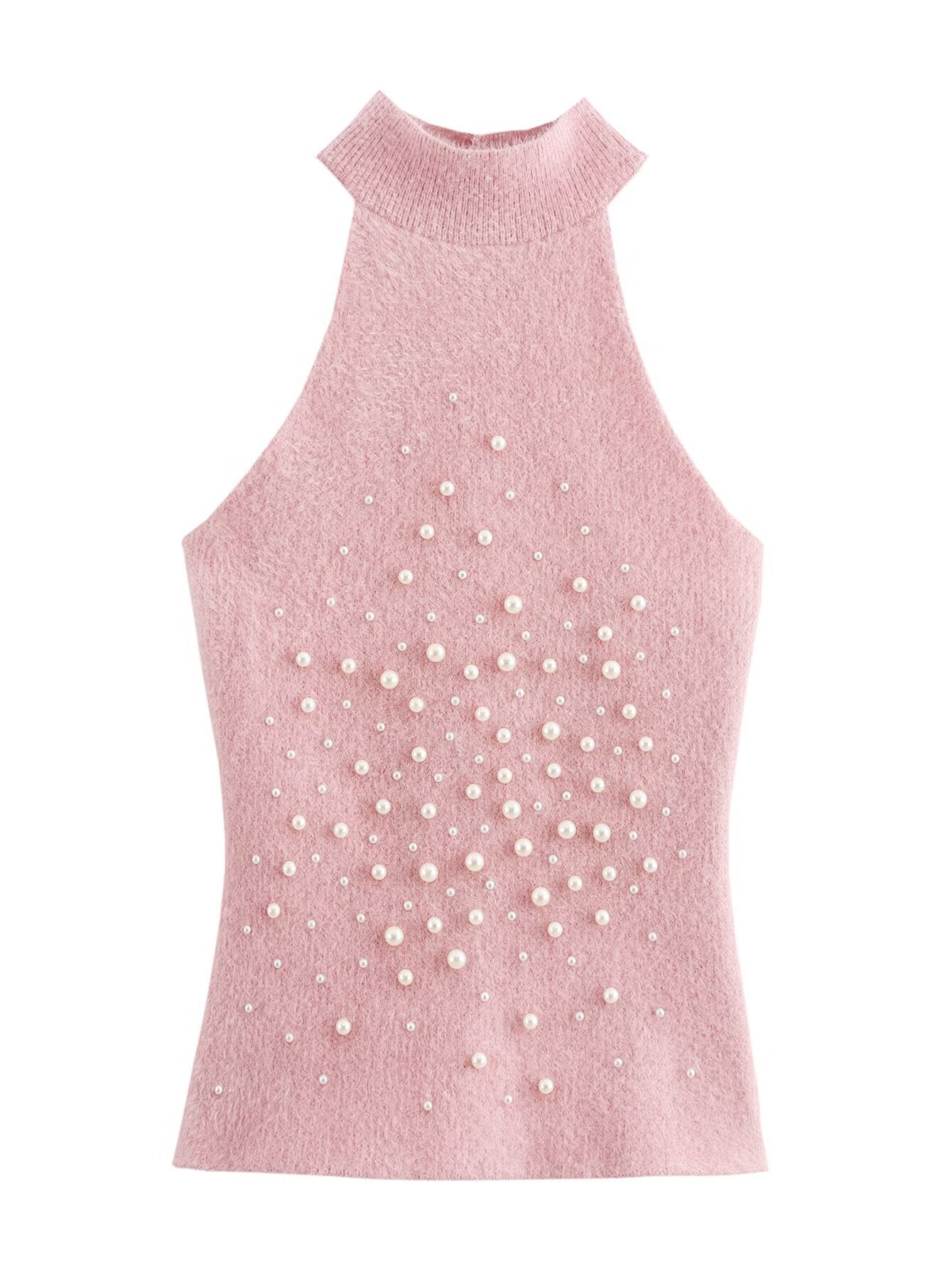 Upptäck vår eleganta ärmlösa topp med dekorativa pärlapplikationer i en öm rosa nyans. Denna raffinerade topp kombinerar stiliga element med en modern passform och för med sig feminin elegans till din garderob.