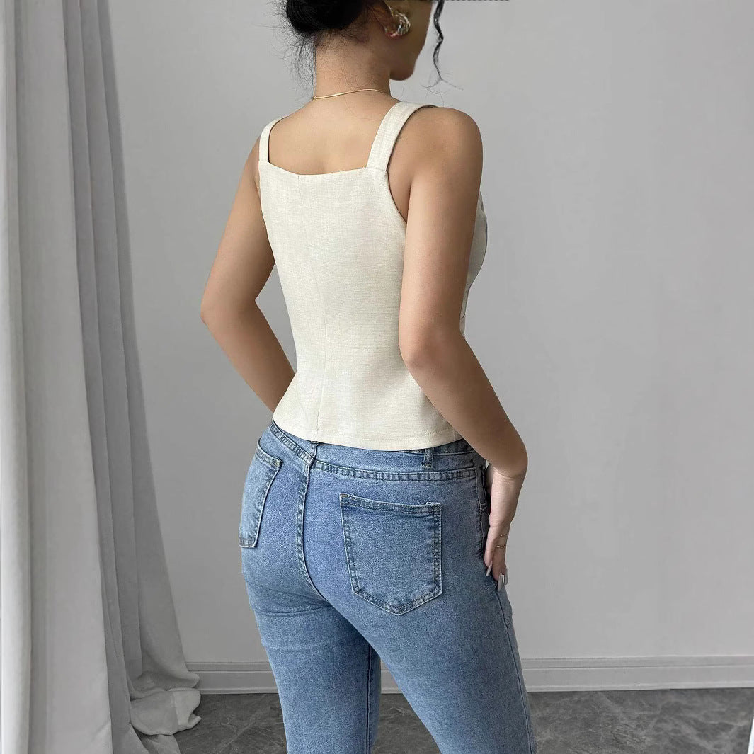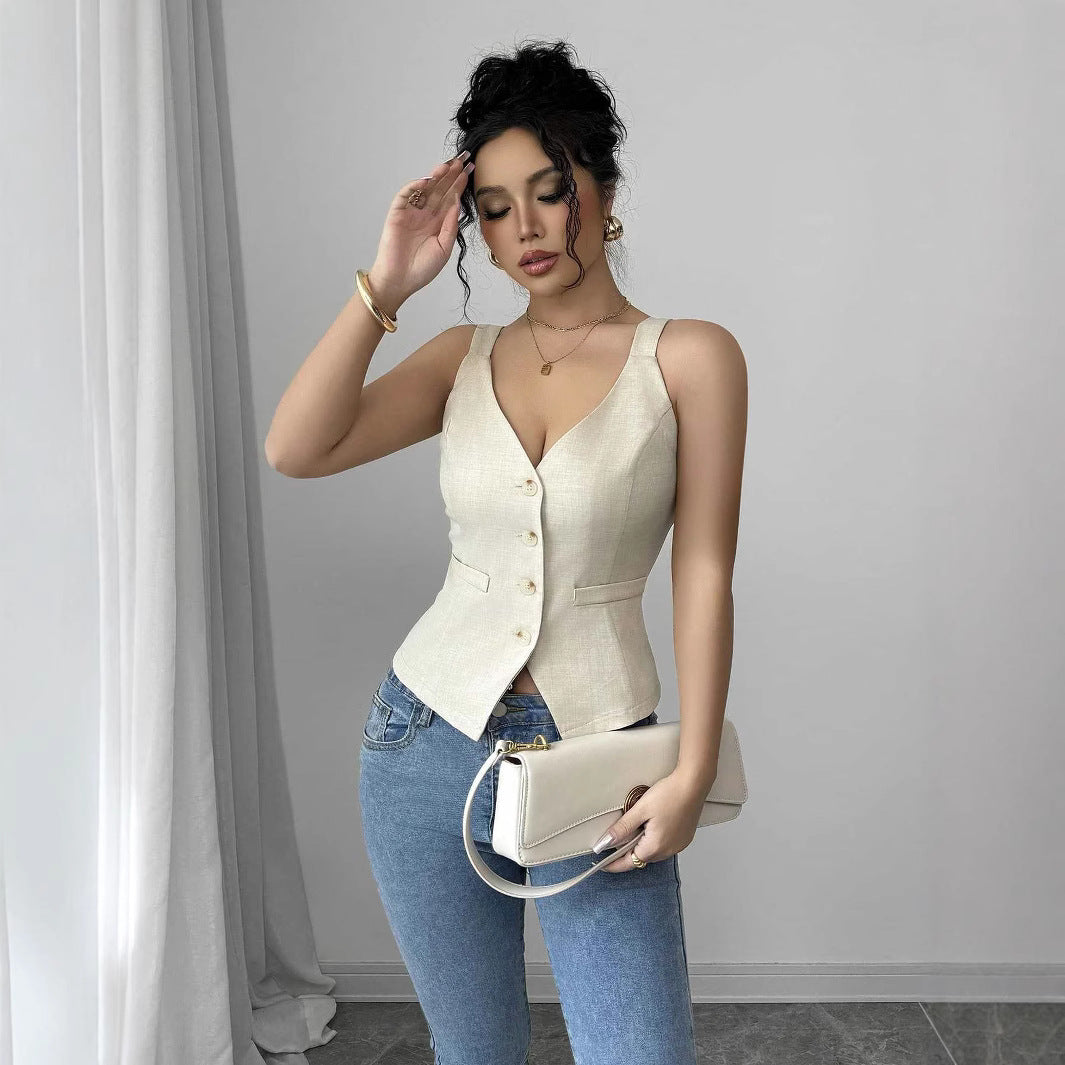 Upptäck den stiliga och mångsidiga dam figursydda västen från Eva Jonsson, som är idealisk för alla tillfällen. Med en elegant design och sofistikerade knappdetaljer är denna överdel perfekt för eleganta kvällar eller avslappnade dagsturer.