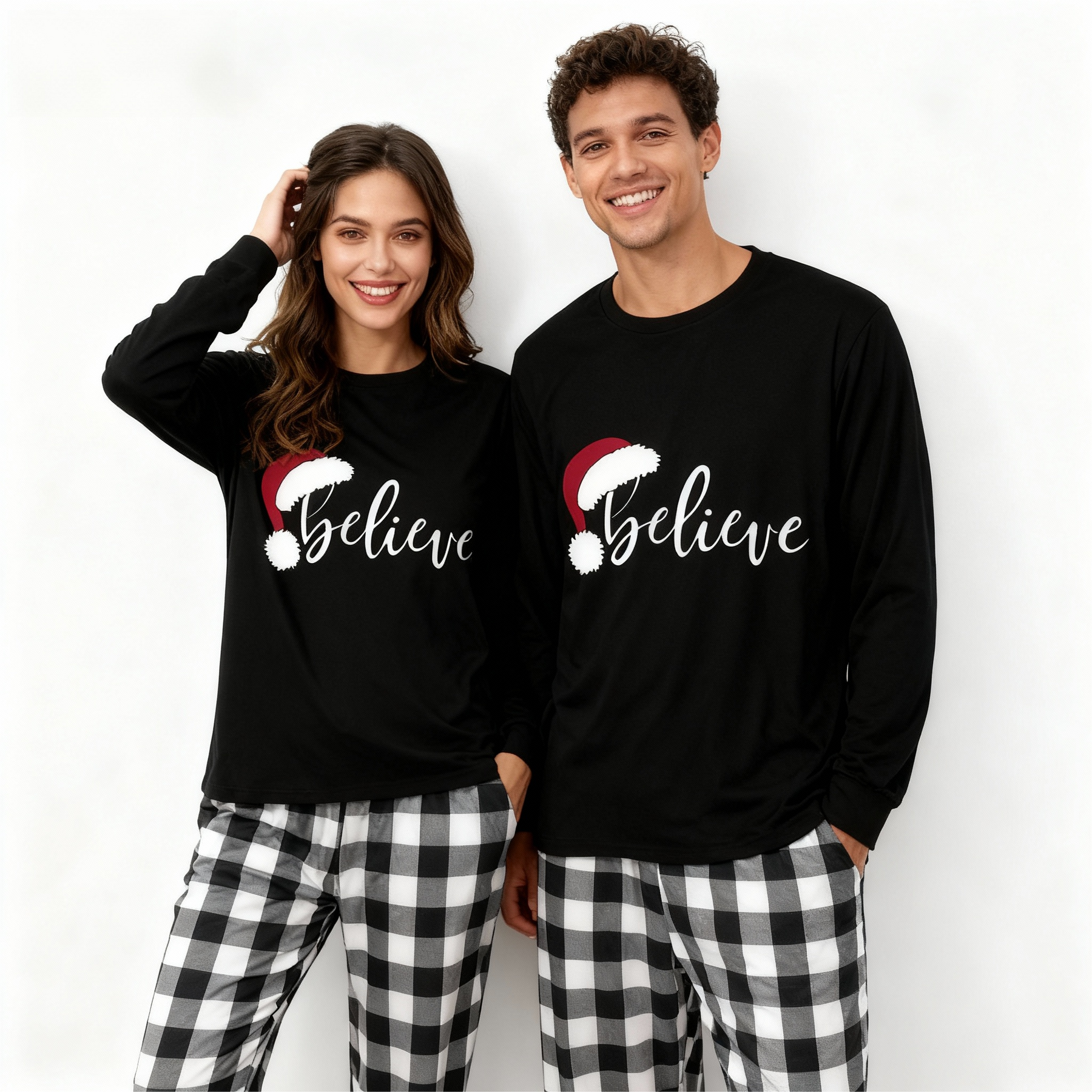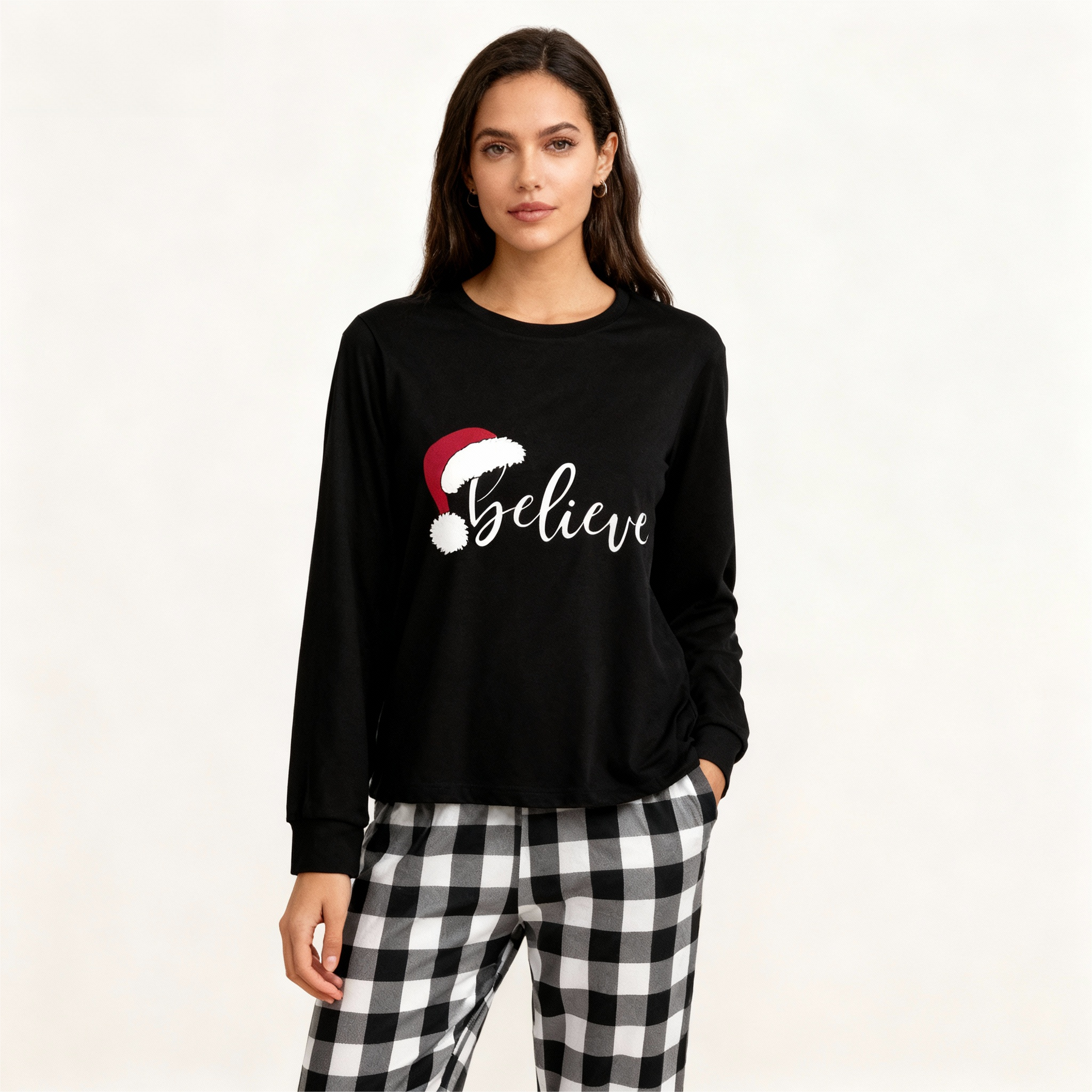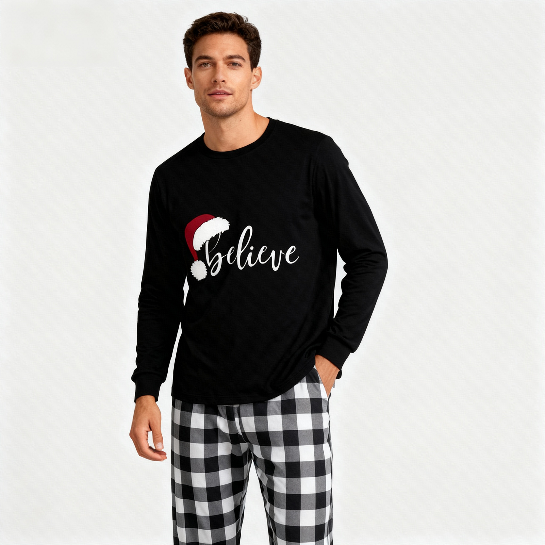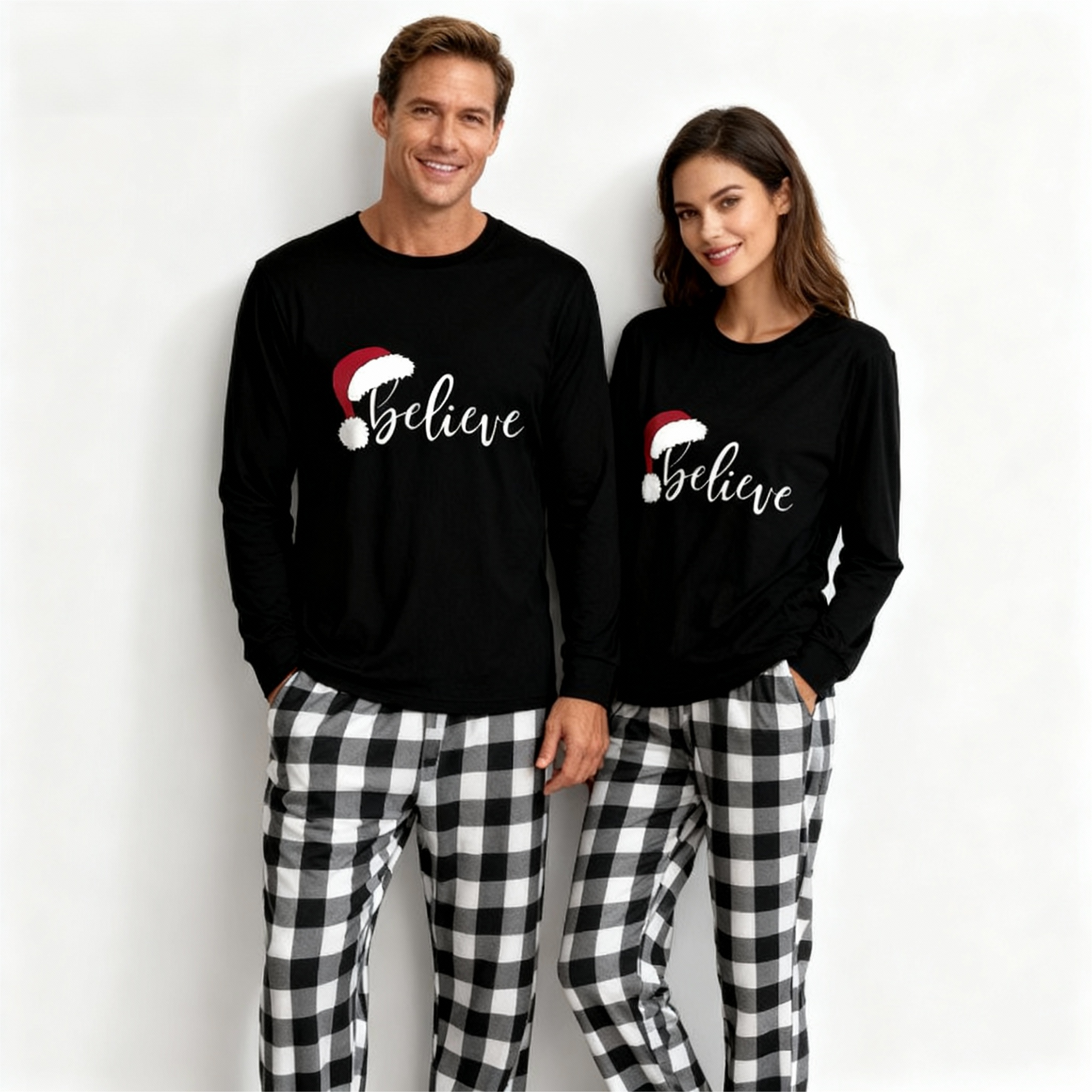 Eva Jonsson | Julmössa och 'Believe' Bokstavstryckt Mönstrat Svart-Vitt Rutigt Pyjamas-Set