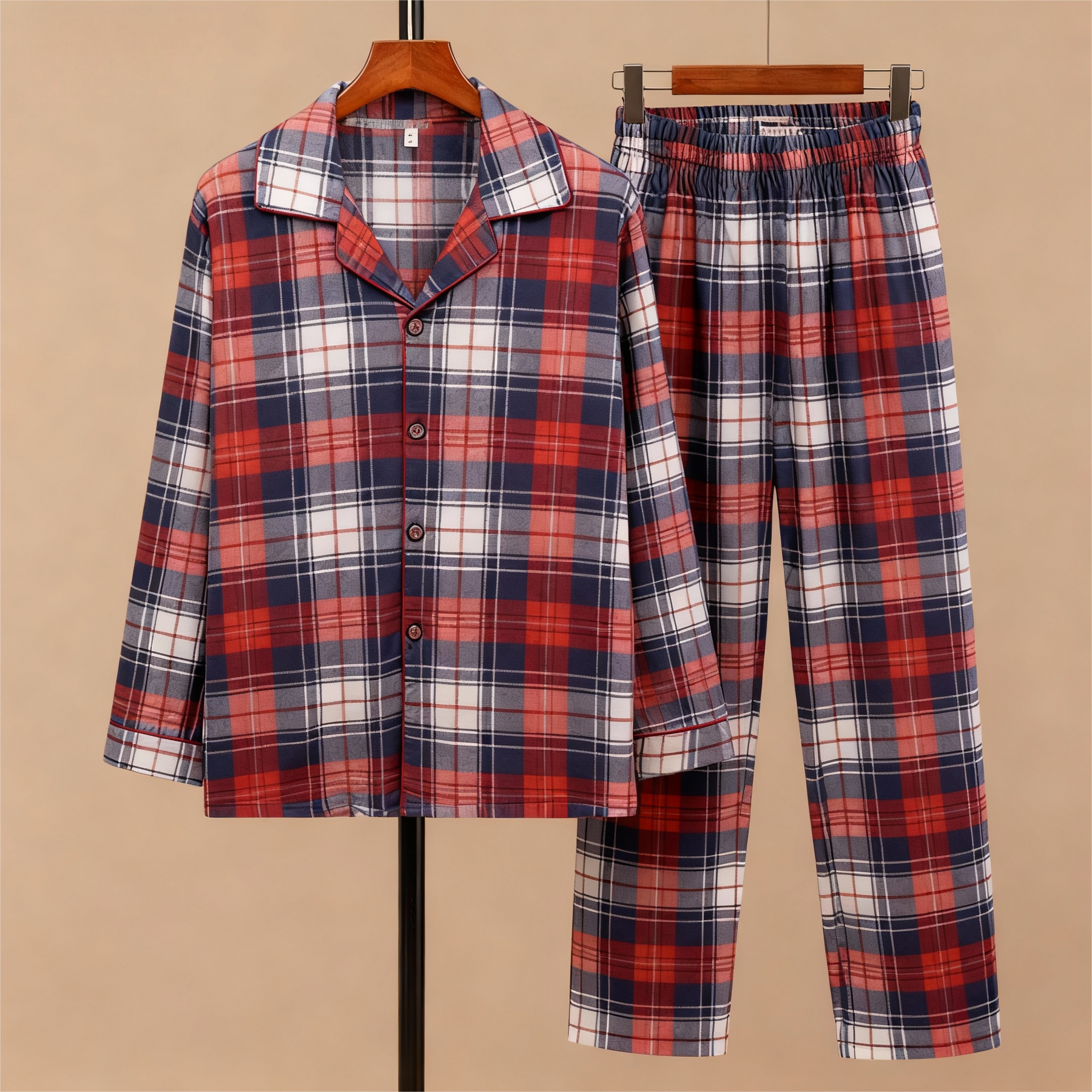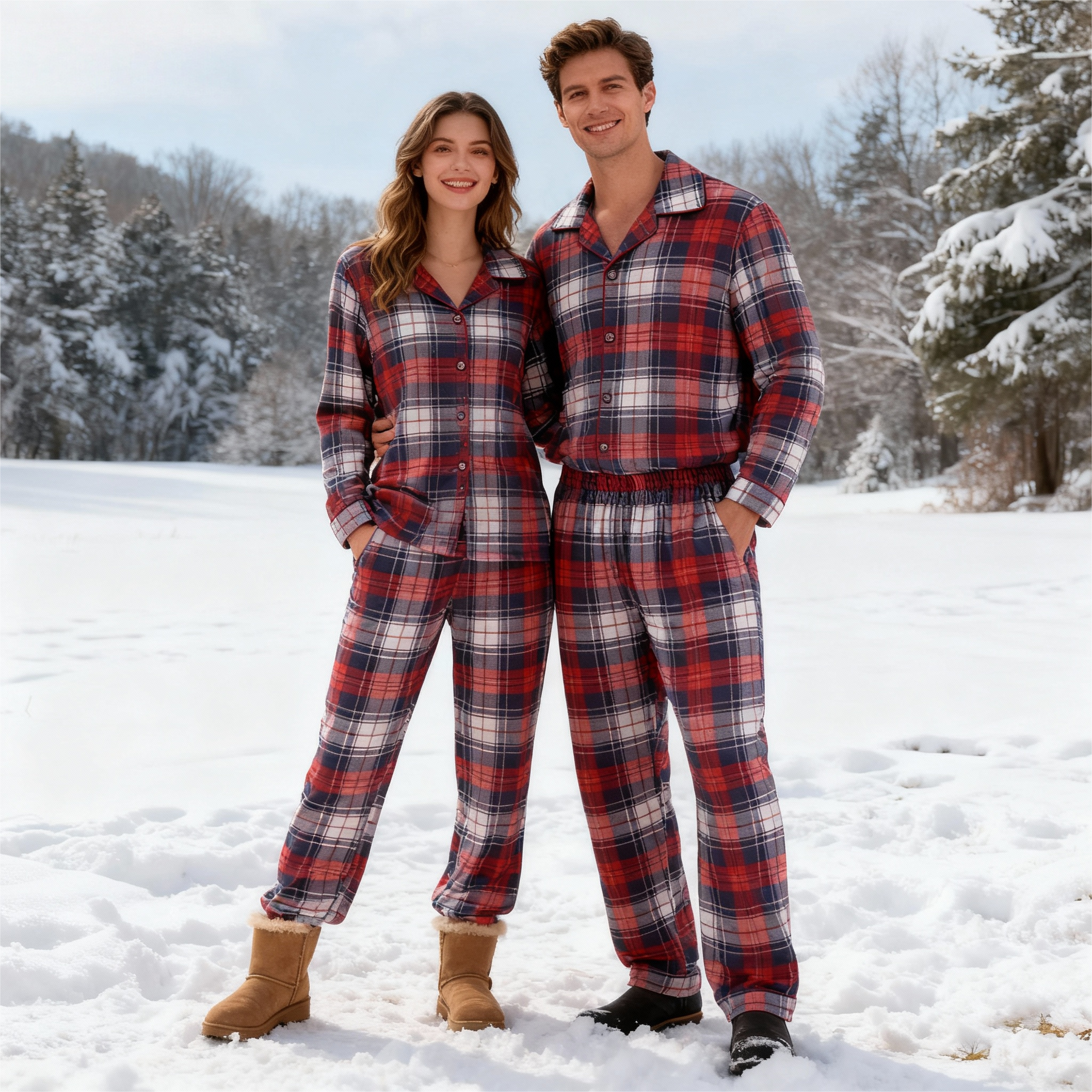 Dessa pyjamas är tillverkade av en förstklassig blandning av 70% bomull och 30% polyester och erbjuder därmed en idealisk kombination av komfort, andningsförmåga och hållbarhet – perfekt för att alltid vara behagligt klädd från julafton till avslappnande vintermorgnar.