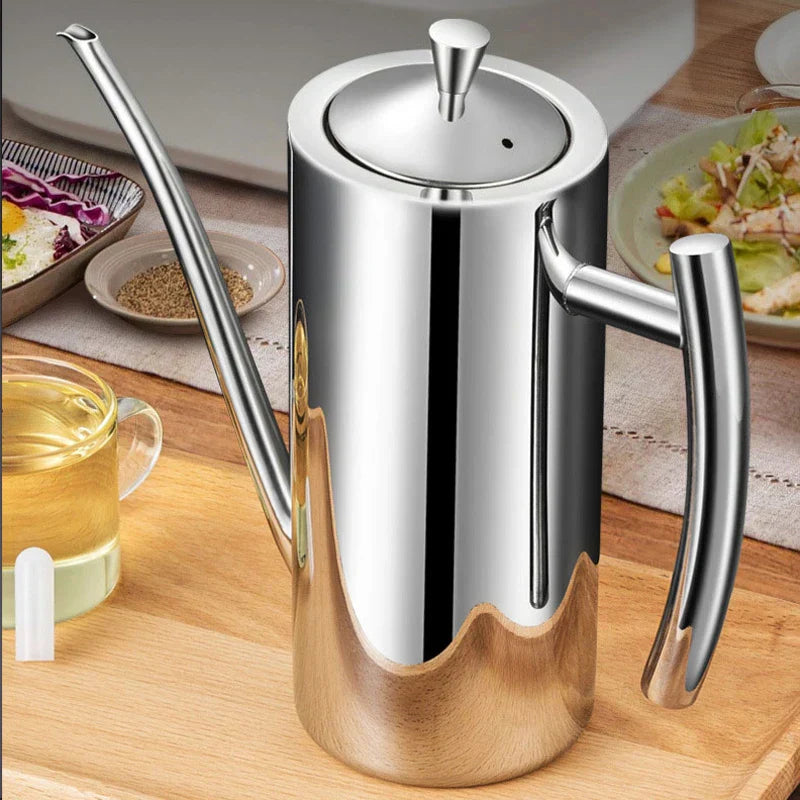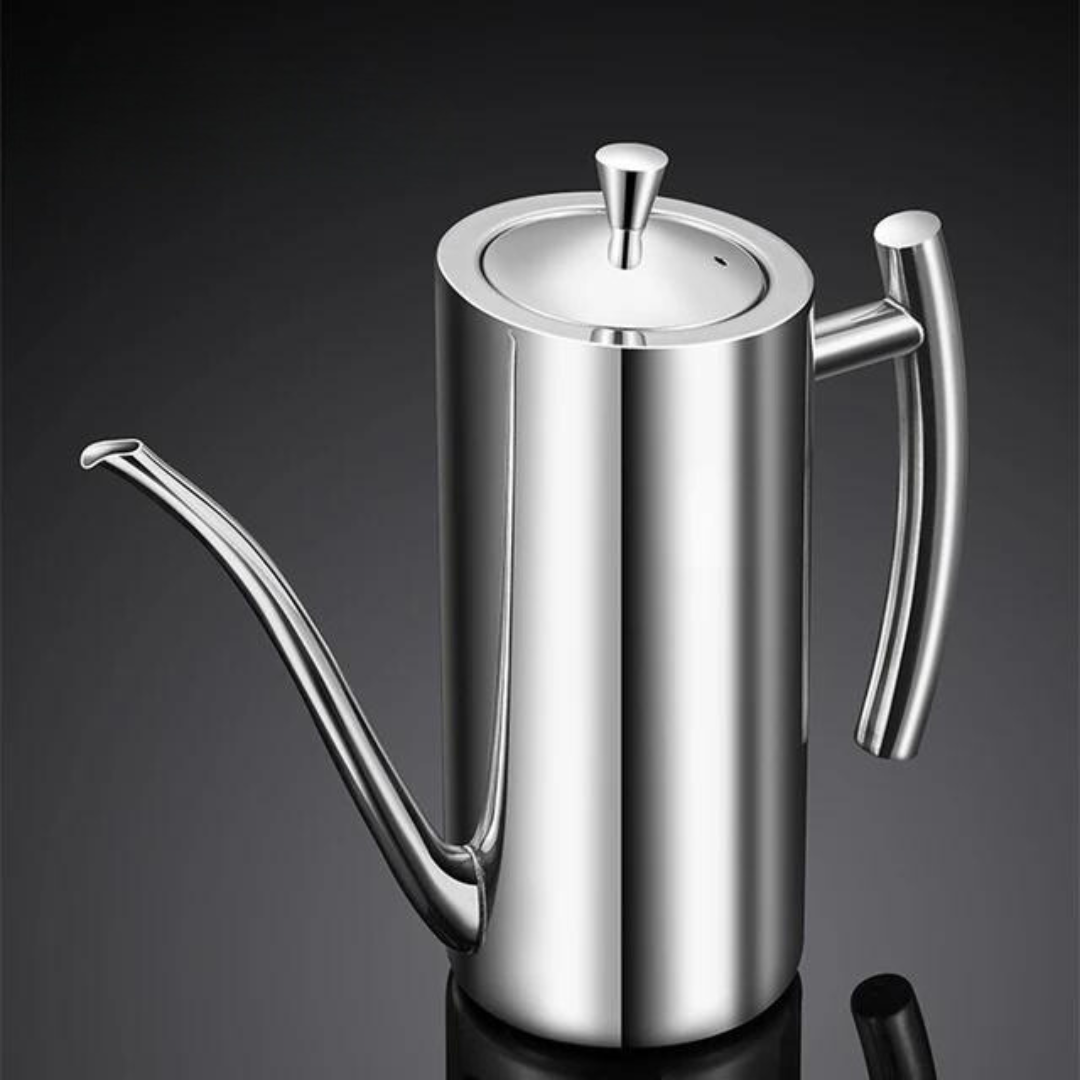 Vår oljedispenser i rostfritt stål är den perfekta tillägget till vilket kök som helst. Tillverkad av högkvalitativt rostfritt stål, är denna behållare designad för att säkert lagra och exakt hälla matoljor, vinäger, såser och andra vätskor.