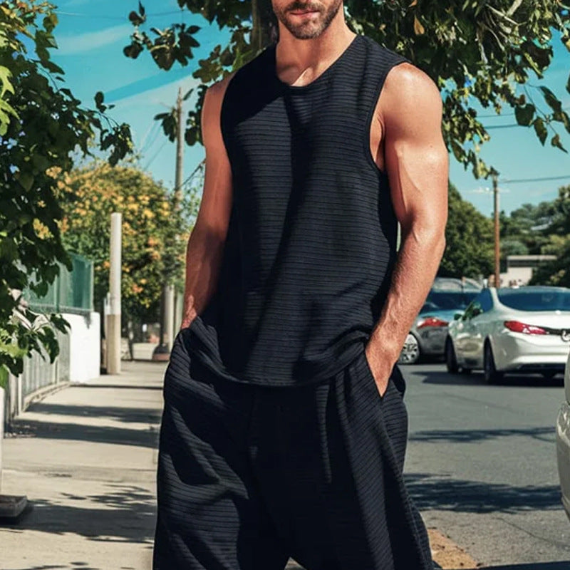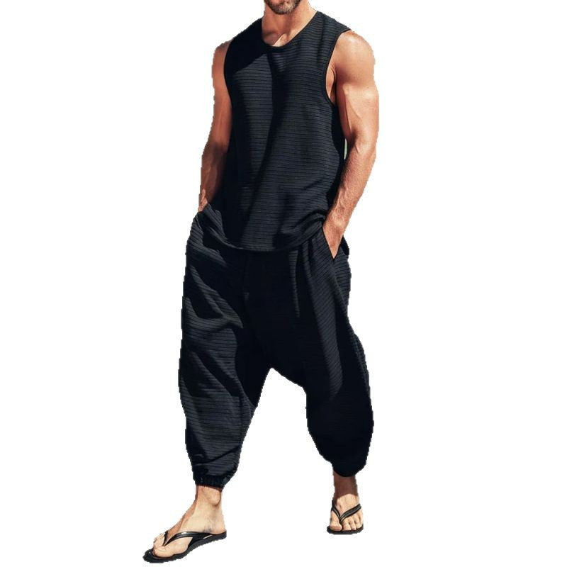 Upptäck vår herravdelning avslappnade sommaroutfit, som är perfekt för årets varma dagar. Detta stiliga set består av en luftig väst och vida byxor, som både erbjuder komfort och en modern silhuett.