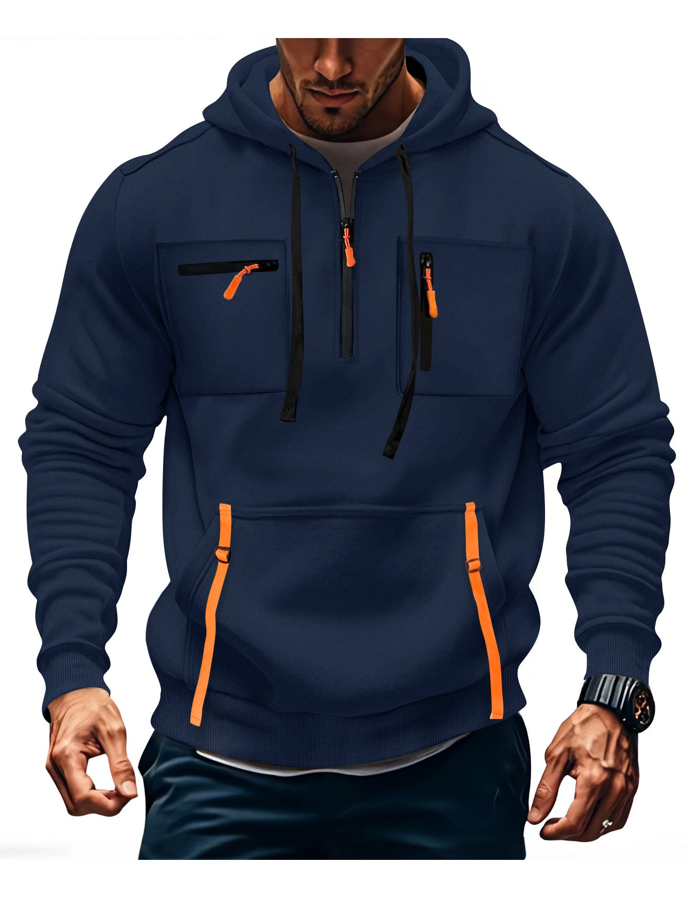 Funktionella fickor: Utrustad med flera dragkedjefickor, ger denna hoodie tillräckligt med utrymme för viktiga föremål som smartphones eller nycklar.