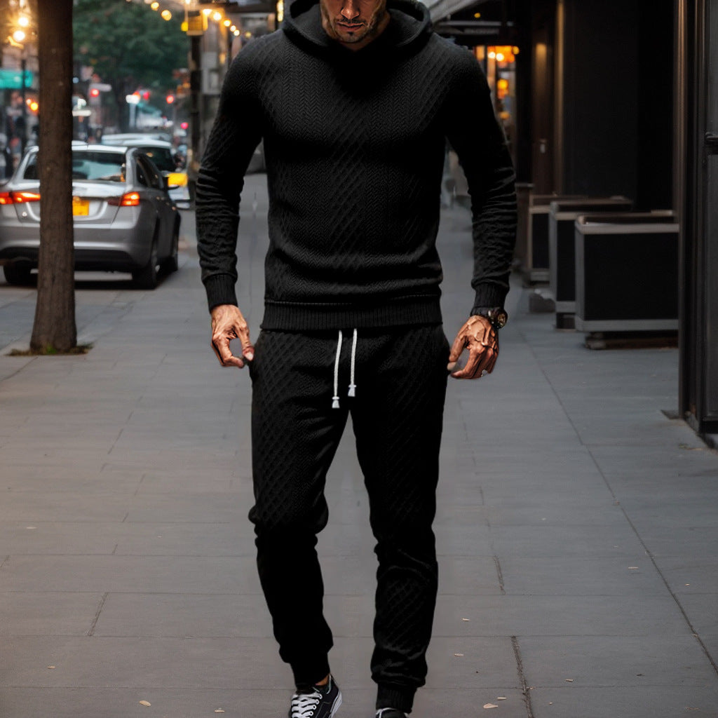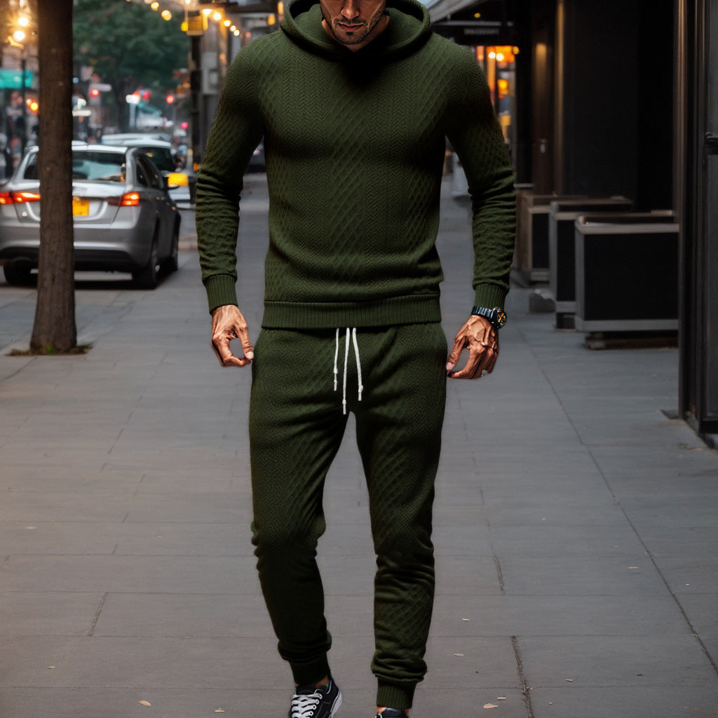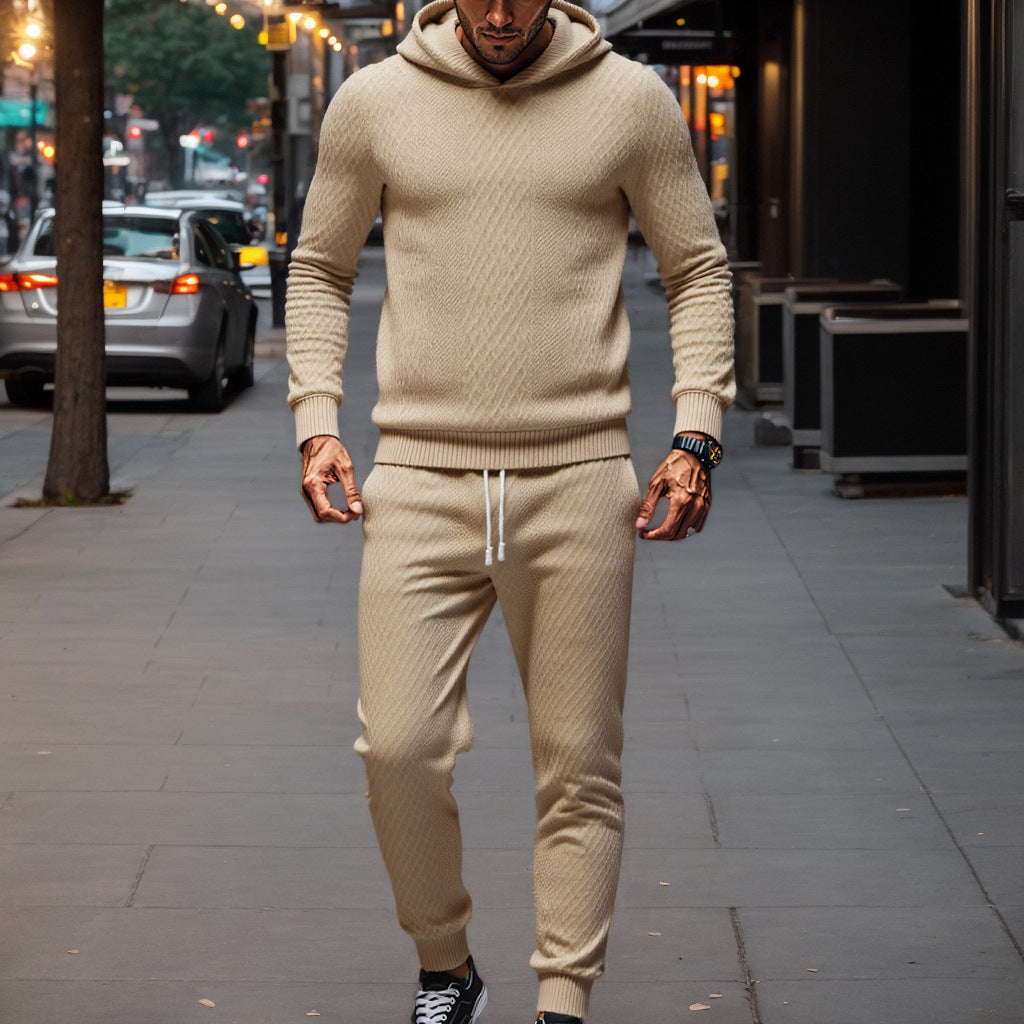 Upptäck den perfekta följeslagaren för avslappnade tillfällen: vår herrstickade fritidsdräkt med huva och modern ribbdesign Eva Jonsson. Denna dräkt förenar komfort med stilrent design.