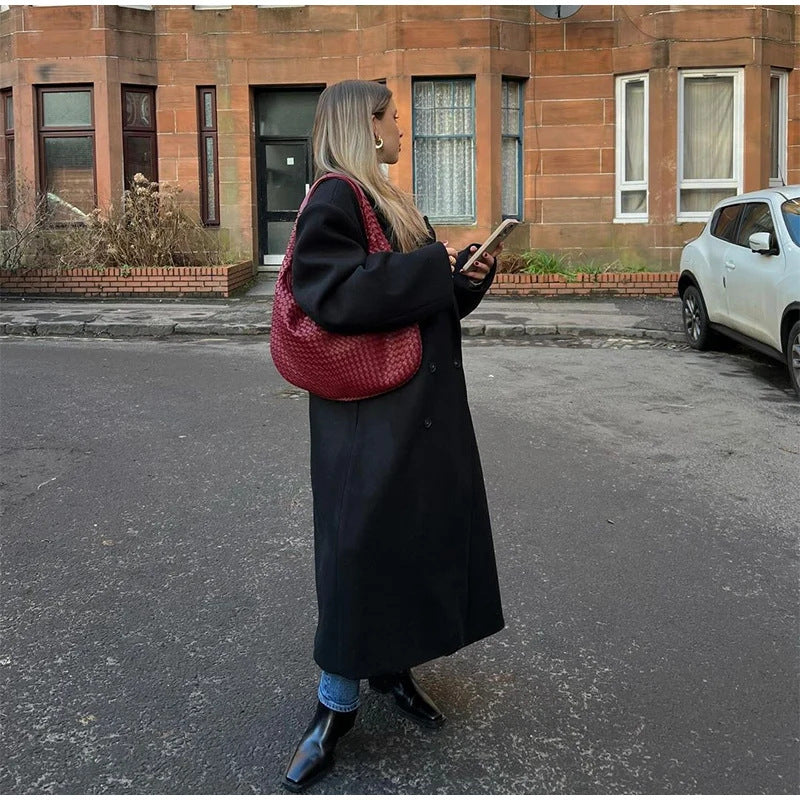 Njuta av den perfekta blandningen av stil och komfort med den långa eleganta dubbelknäppta kappan från Eva Jonsson – ett måste i varje modern garderob.
