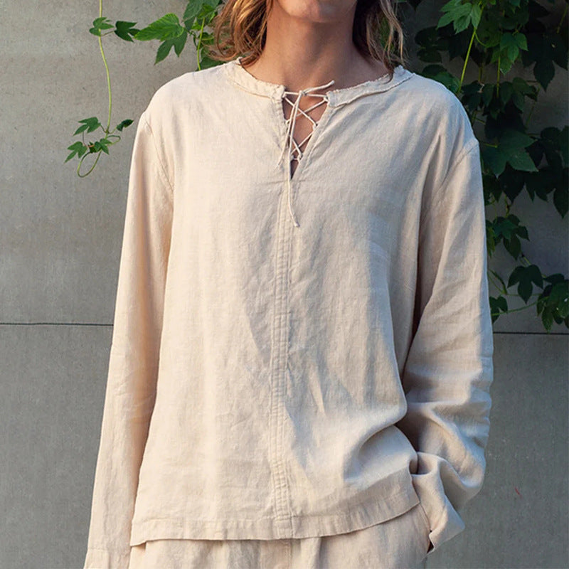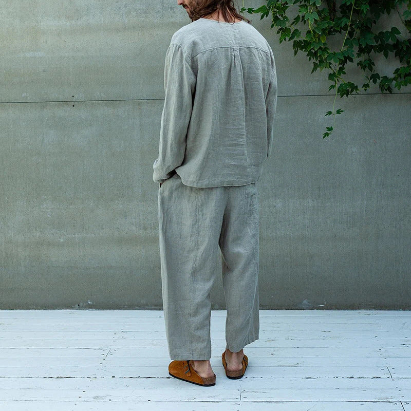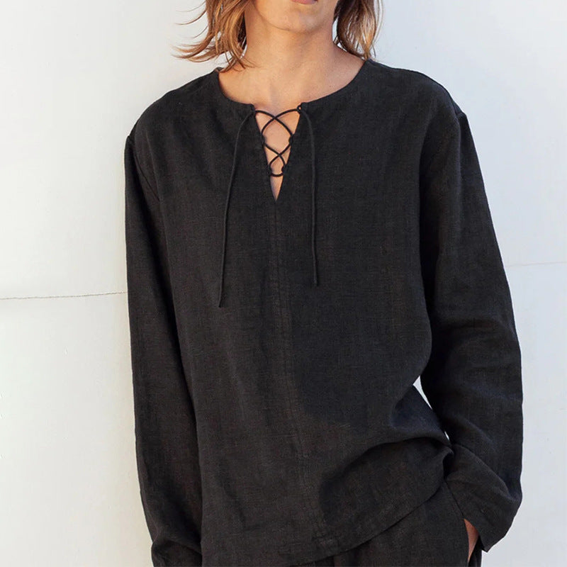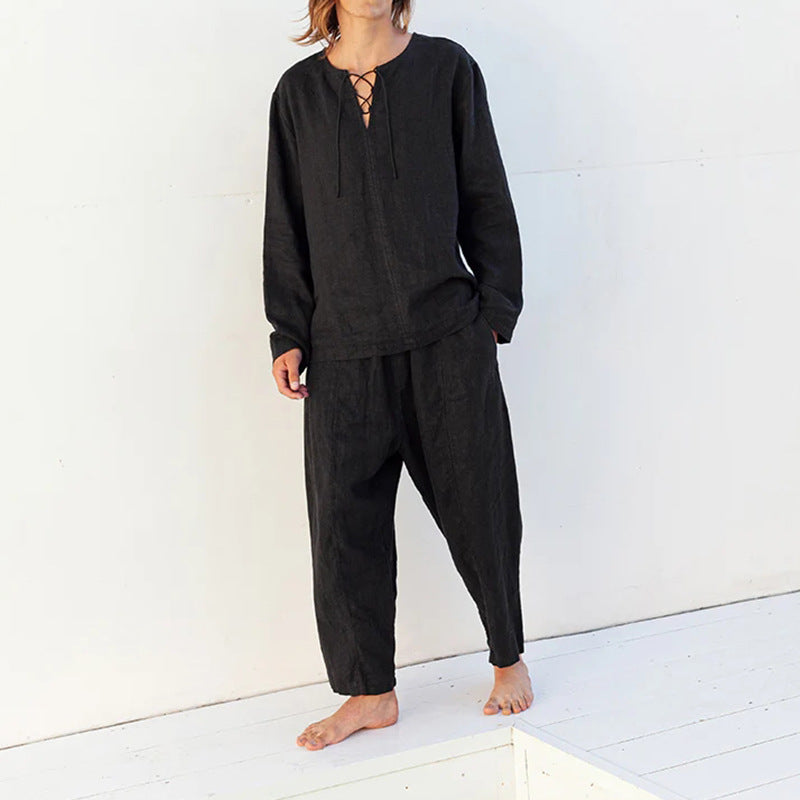 Upptäck vår herravdelning med snörning och bekväma byxor, som är perfekta för avslappnade fritidsaktiviteter. Denna kombination av topp och byxor är inte bara stilren utan också ytterst bekväm, tack vare det högkvalitativa materialet och den genomtänkta passformen.