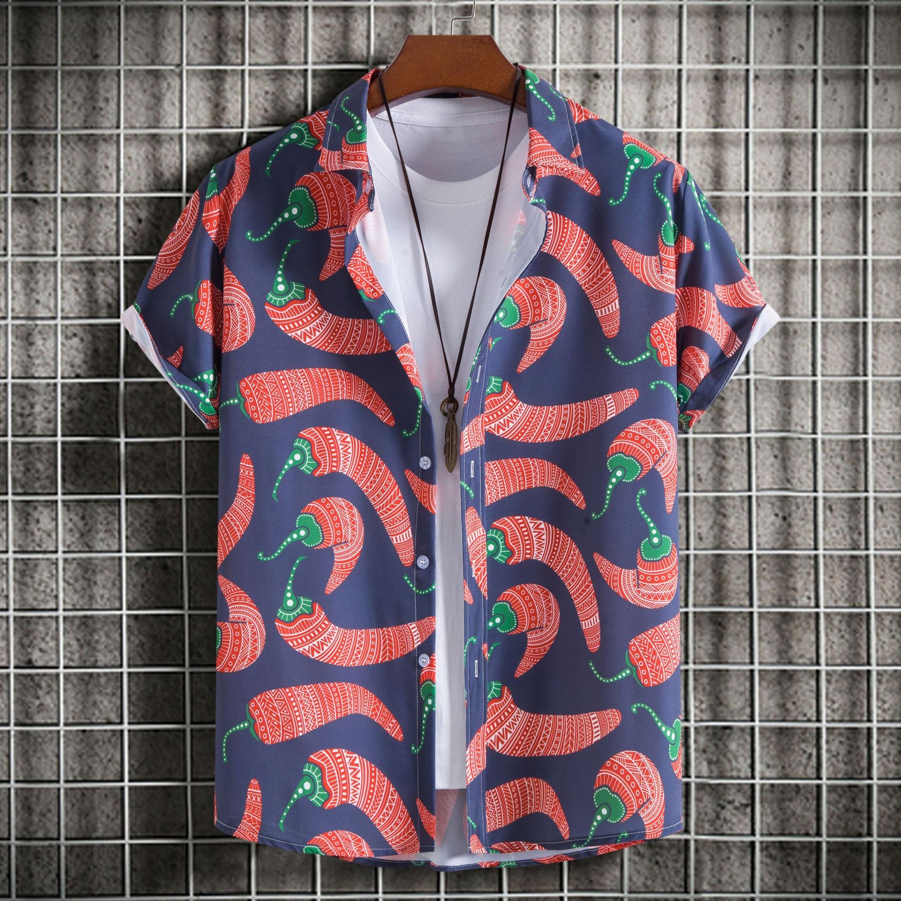 Upptäck vår herrkortärmad skjorta i det kreativa chili-mönstret, som perfekt kombinerar stil och komfort. Denna skjorta i högkvalitativ, andningsbar bomull erbjuder ett unikt tryck som höjer varje look.