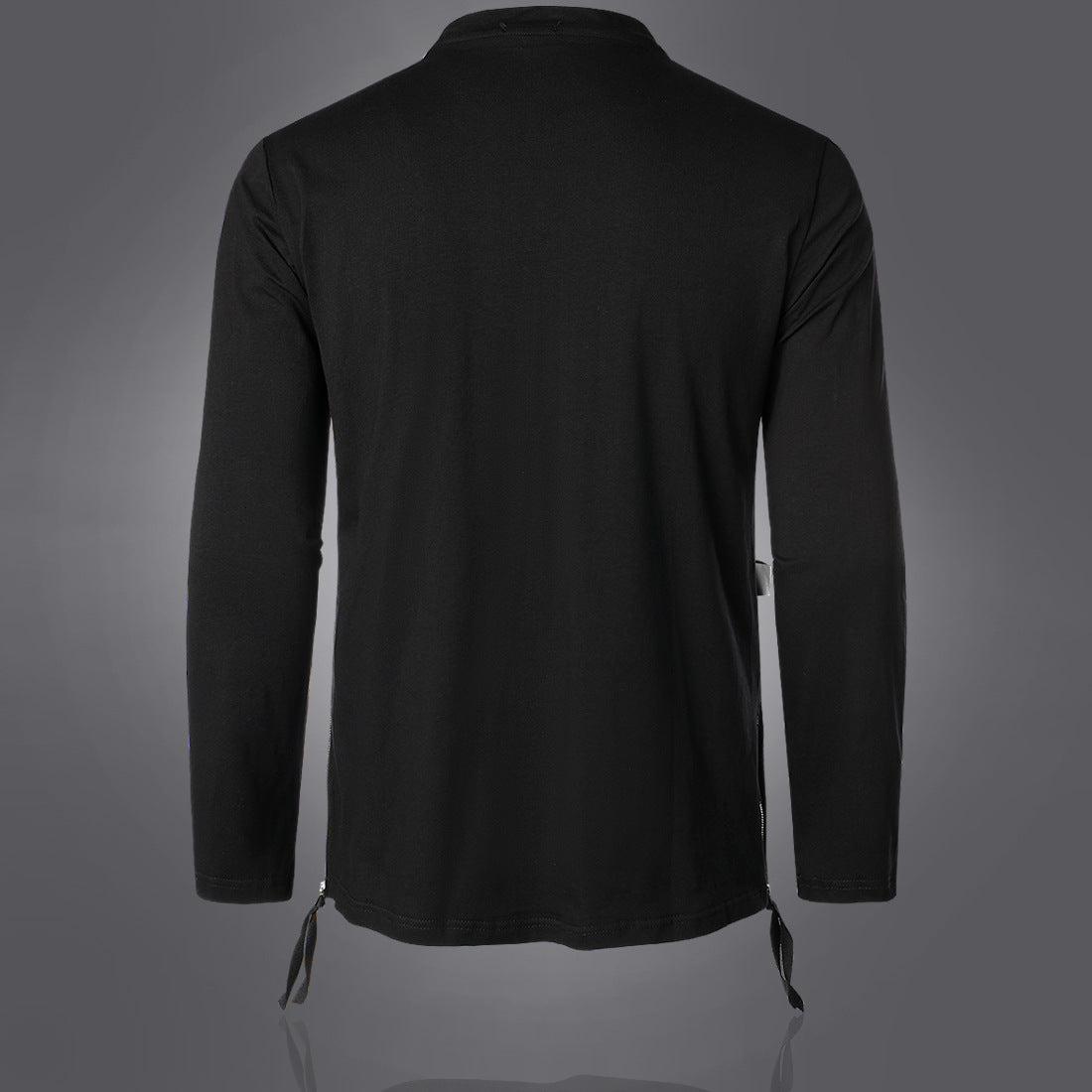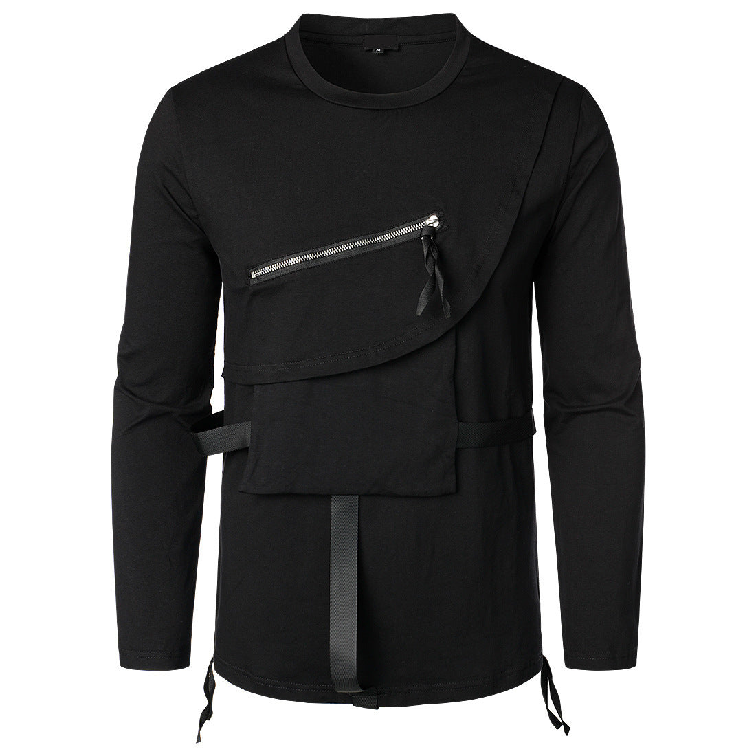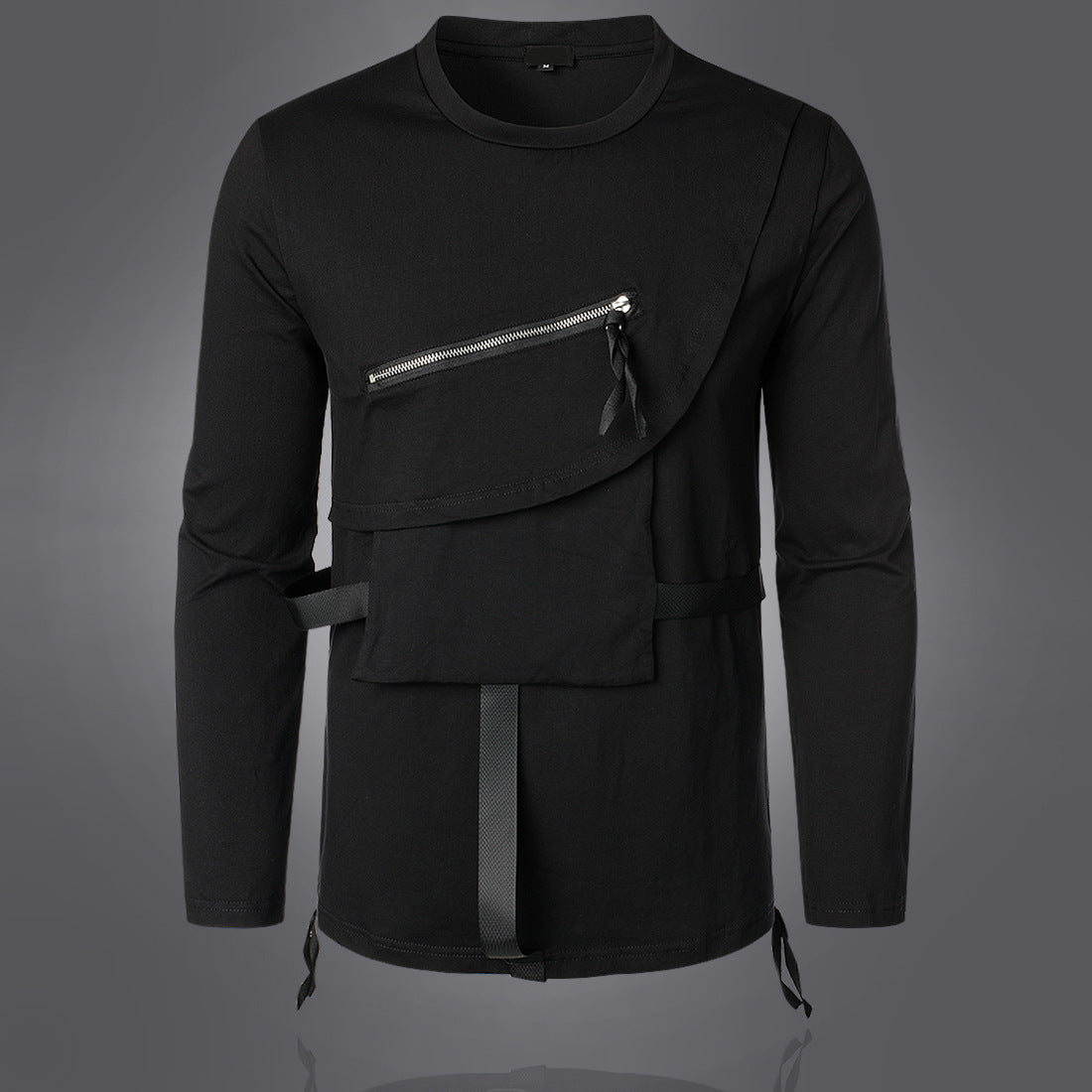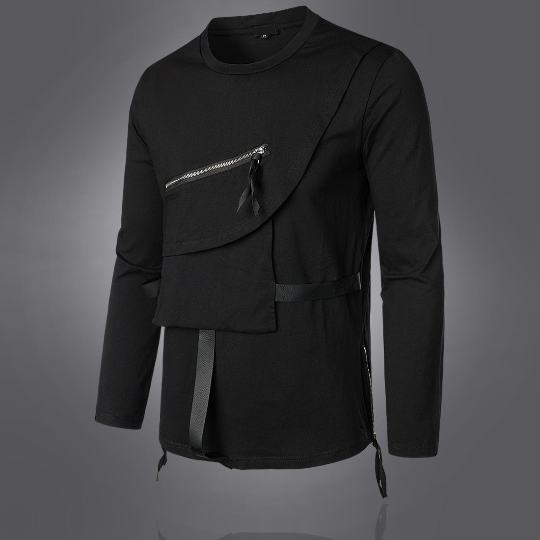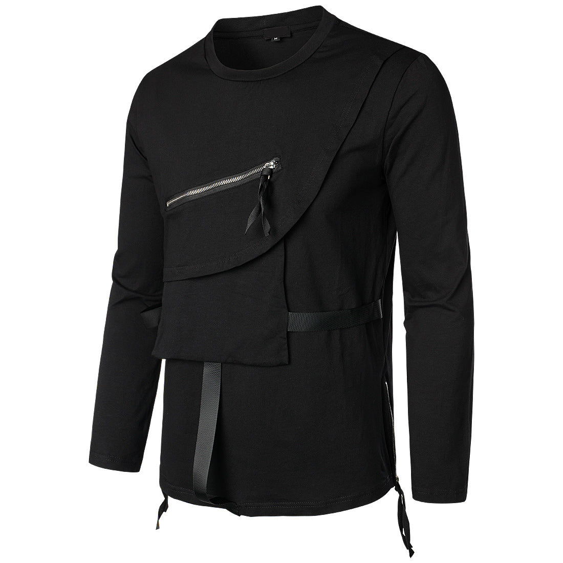 Upptäck vår herrmode långärmad tröja med asymmetrisk design och praktisk bröstficka. Denna tröja kombinerar en modern stil med funktionella detaljer, perfekt för den urbana vardagen.