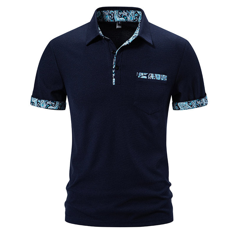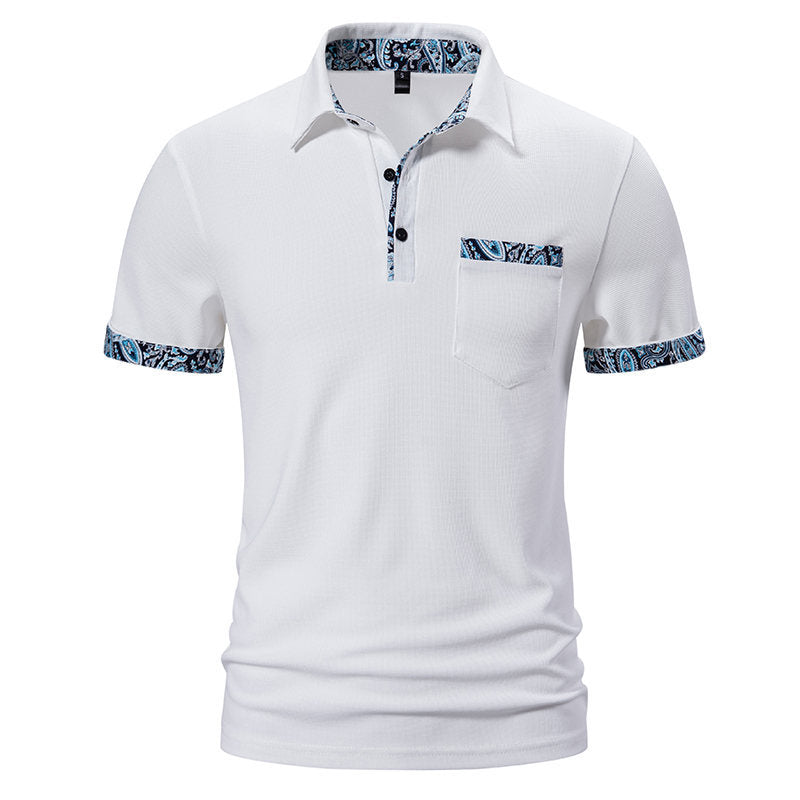 Upptäck vår exklusiva herrpoloshirt som förenar stil och komfort. Denna poloshirt utmärker sig med en modern, kontrasterande krage och en praktisk bröstficka som erbjuder både funktionalitet och mode. Tillverkad av högkvalitativa material, ger den en bekväm känsla och en optimal passform.