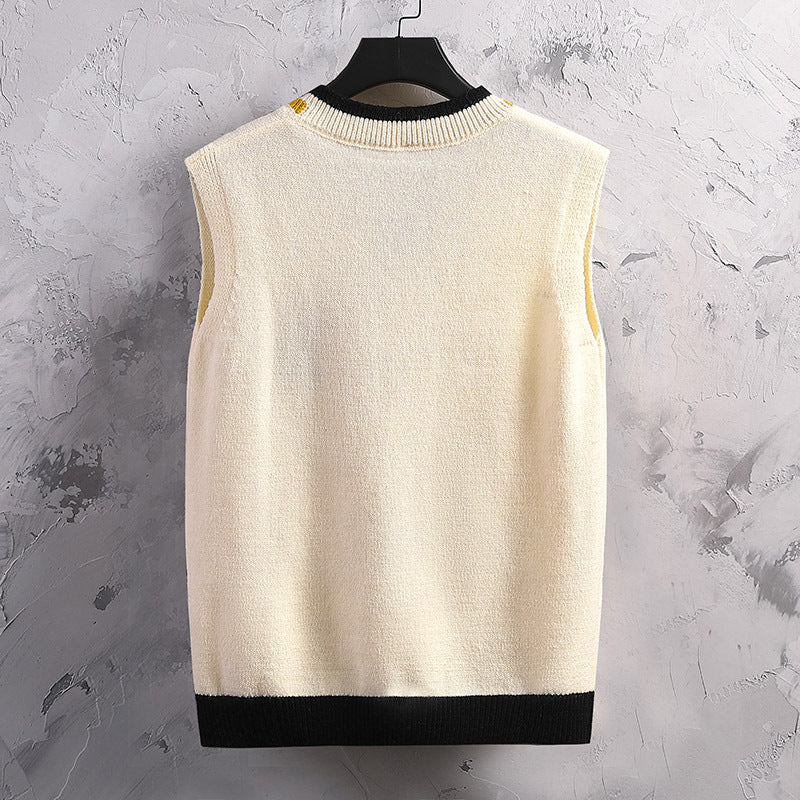 Upptäck den stiliga herrärmlösa stickade tröjan som imponerar med sin moderna och iögonfallande färgblockdesign. Denna stickade tröja är perfekt för en avslappnad och elegant look och passar utmärkt för olika tillfällen.